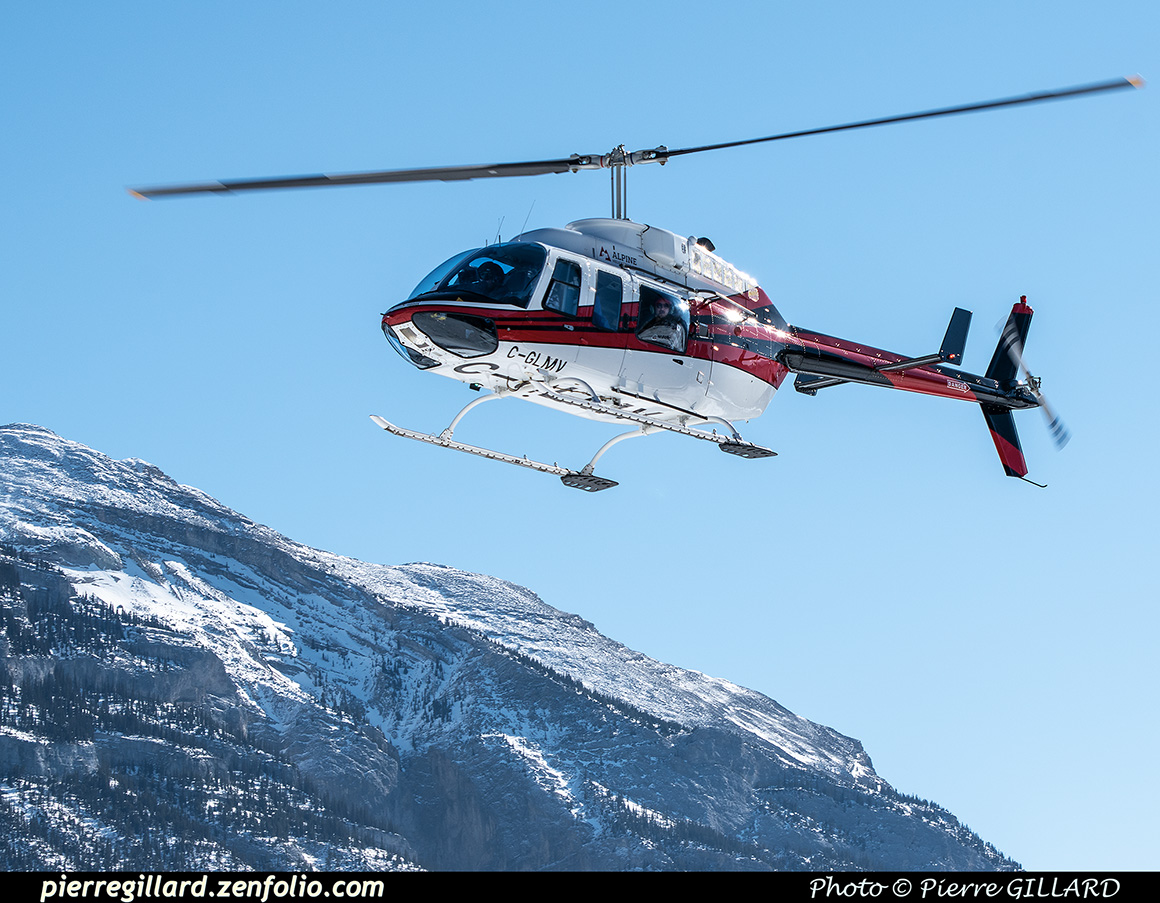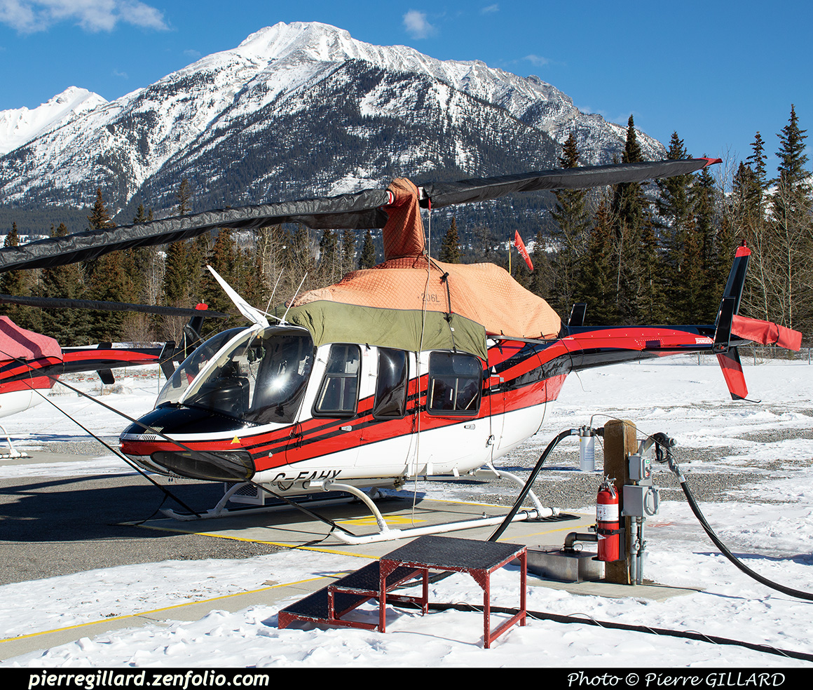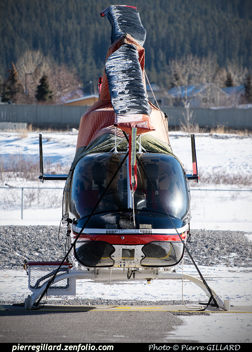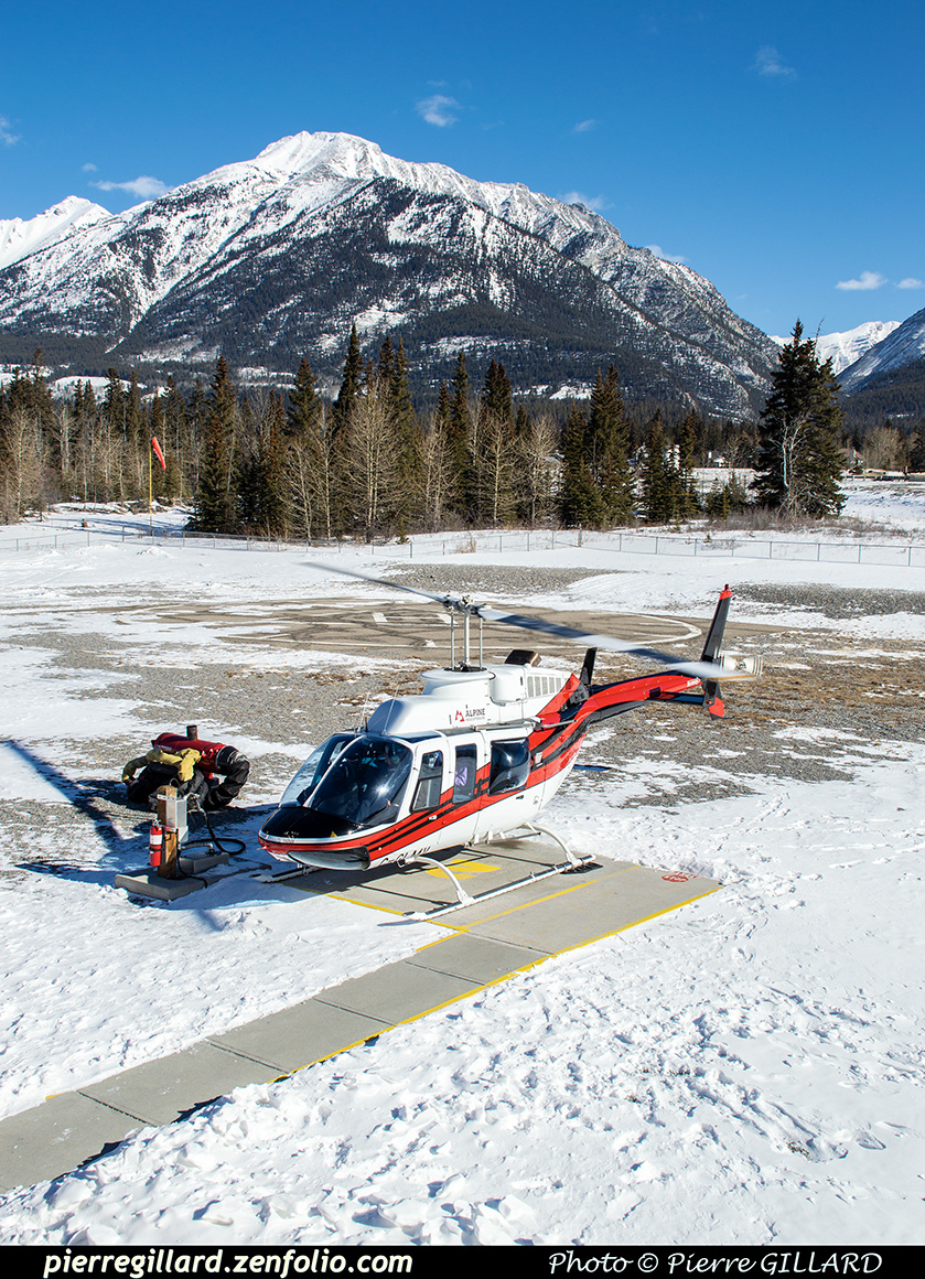 Ayant déjà eu l’occasion de m’y rendre à plusieurs reprises en 2005, 2007 et 2008, j’y retourne aujourd’hui accompagné de mes deux amis, Nicolas et Pierre. Lorsque nous arrivons à l’héliport, trois hélicoptères sont stationnés sur leur pad bien emmitouflés dans leurs couvertures et protections : il y a un Bell 206L LongRanger (C-FAHX) ainsi que deux Bell 407 (C-FALU et C-FNOB). Un second Bell 206L (C-GLMV) est en vol et doit arriver un quart d’heure plus tard. |