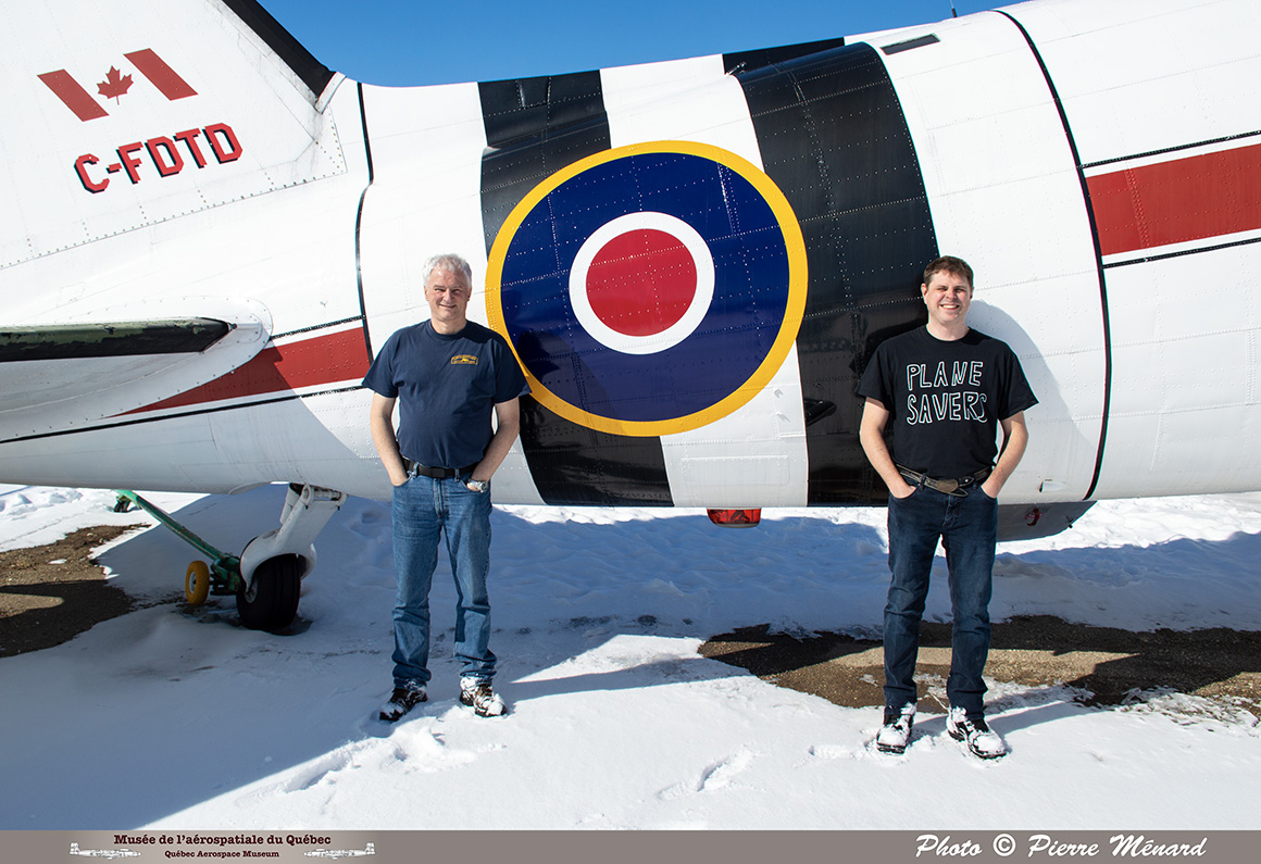 | Pierre Gillard et Nicolas Mailloux à côté du Douglas DC-3C Dakota C-FDTD - Musée de l’aérospatiale du Québec - Red Deer, AB - CYQF - 14-03-2023. |