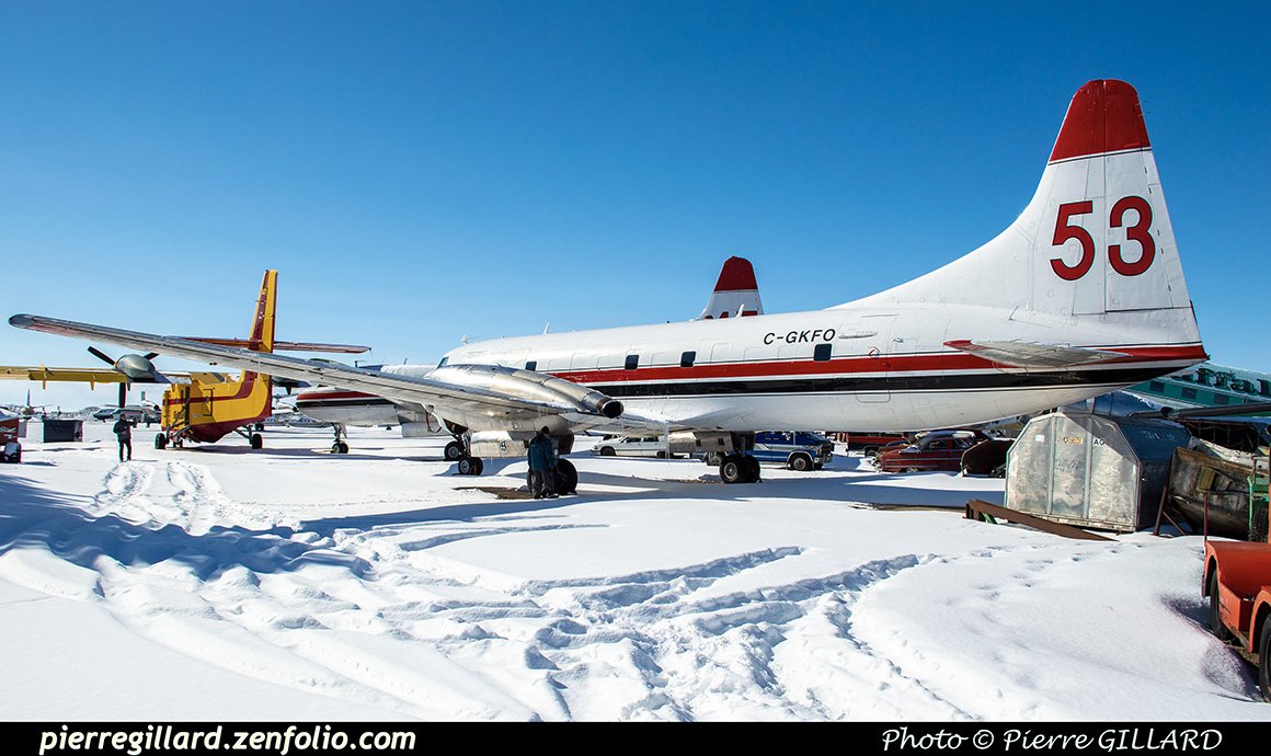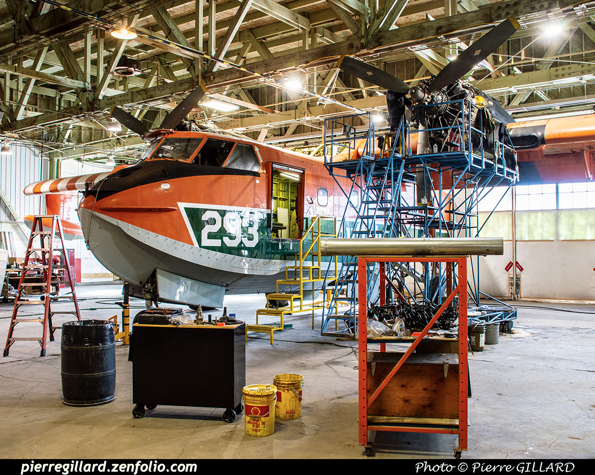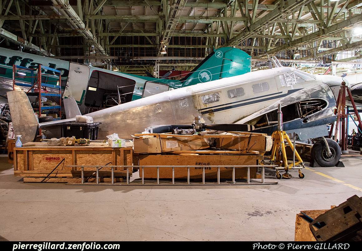 Nous effectuons ensuite le tour du propriétaire où nous observons des Canadair CL-215, des Convair 580, des DC-3 et des Lockheed L.188 Electra. Dans le Hangar 3, il y a encore deux DC-3, un Beechcraft Baron équipé d’un FLIR, des fuselages de Beech King Air, le fuselage du Beech 18 qui était autrefois entreposé à l’extérieur, le Bell 206 Jet Ranger et le Robinson R22. Il y a aussi une structure de Norseman et deux CL-215 sont en maintenance. |
