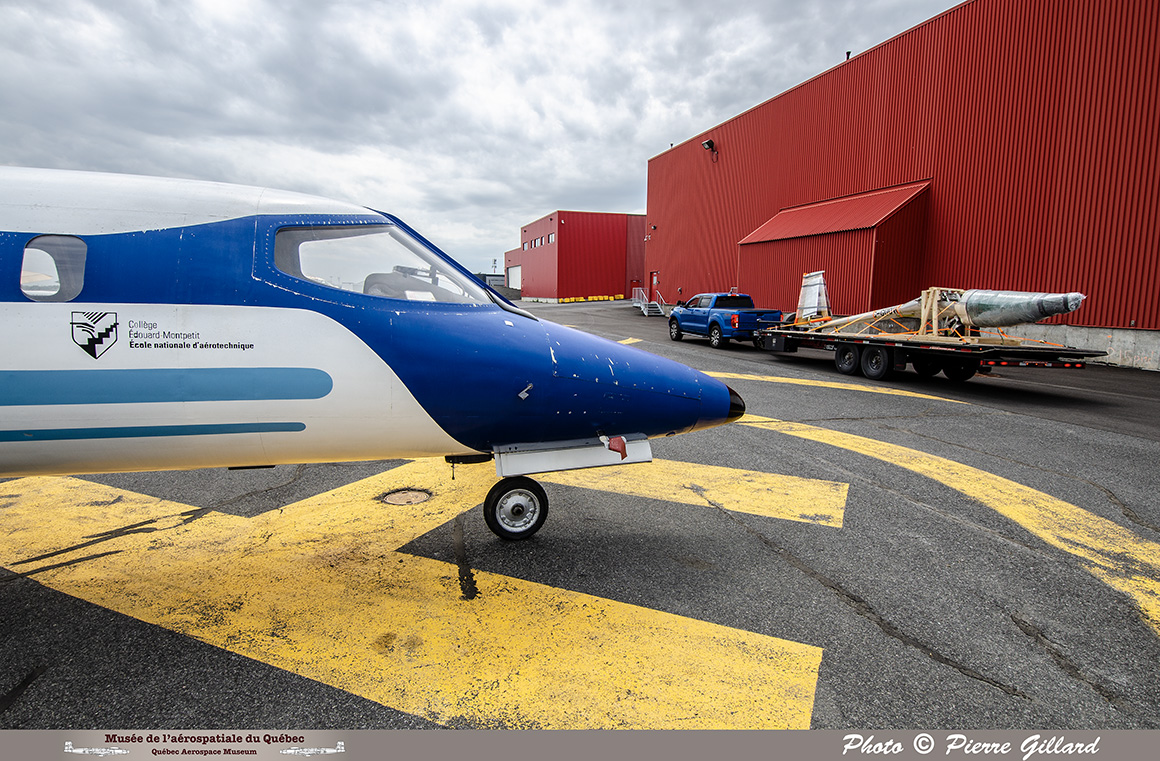 C’est donc vers 14h30 que le planeur arrive à sa nouvelle destination en franchissant l’entrée de l’École nationale d’aérotechnique. Sur place, ce sont cinq membres du MAQ (Stéphane et Philippe déjà mentionnés, plus Louise, Édouard et moi-même) qui s’affairent à décharger précautionneusement le fuselage du planeur. Le plateau inclinable de la remorque facilite très certainement l’opération. |