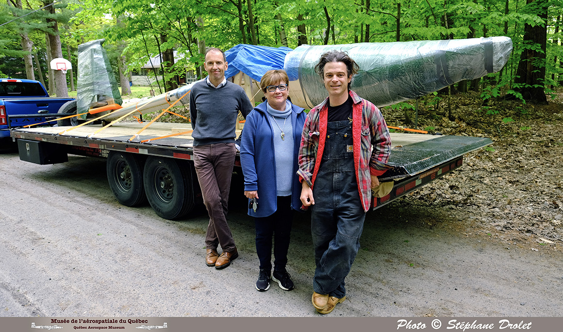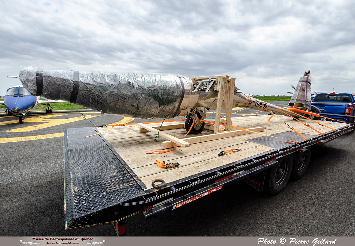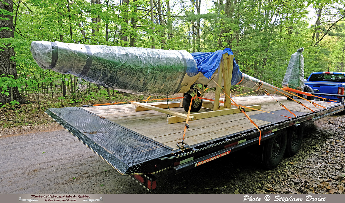À Vaudreuil-Dorion en matinée, Stéphane Drolet, le coordonnateur du projet Mortensen du MAQ, aidé par deux bénévoles, Philippe et Blake, charge donc le fuselage du planeur sur une magnifique remorque-plateau de 24 pieds à inclinaison hydraulique. Le grand luxe ! Afin de maintenir la stabilité du fuselage sur la remorque, Stéphane a préparé une solide structure réalisée en 2x4. Une fois le tout bien attaché, le convoi a fière allure ! Céline, la liquidatrice de la succession de Peder Mortensen, l'ingénieur concepteur du planeur, assiste à toute l'opération également. |