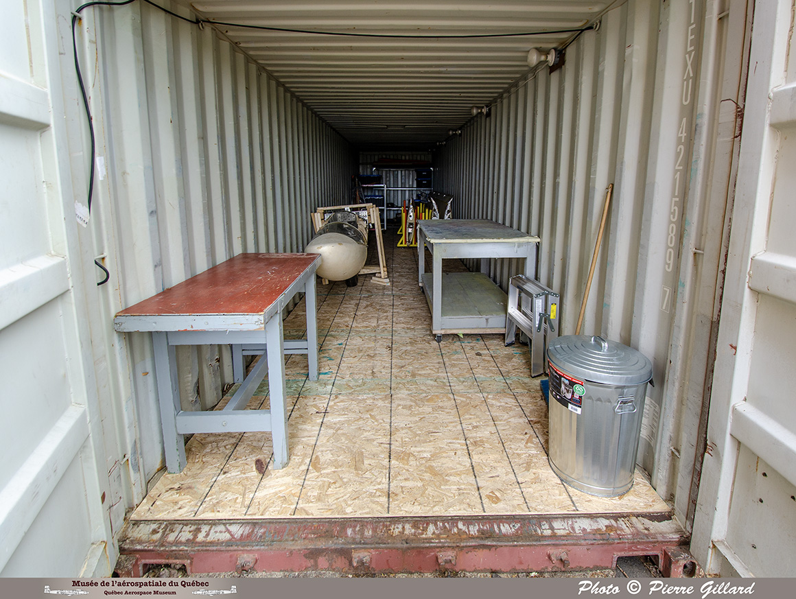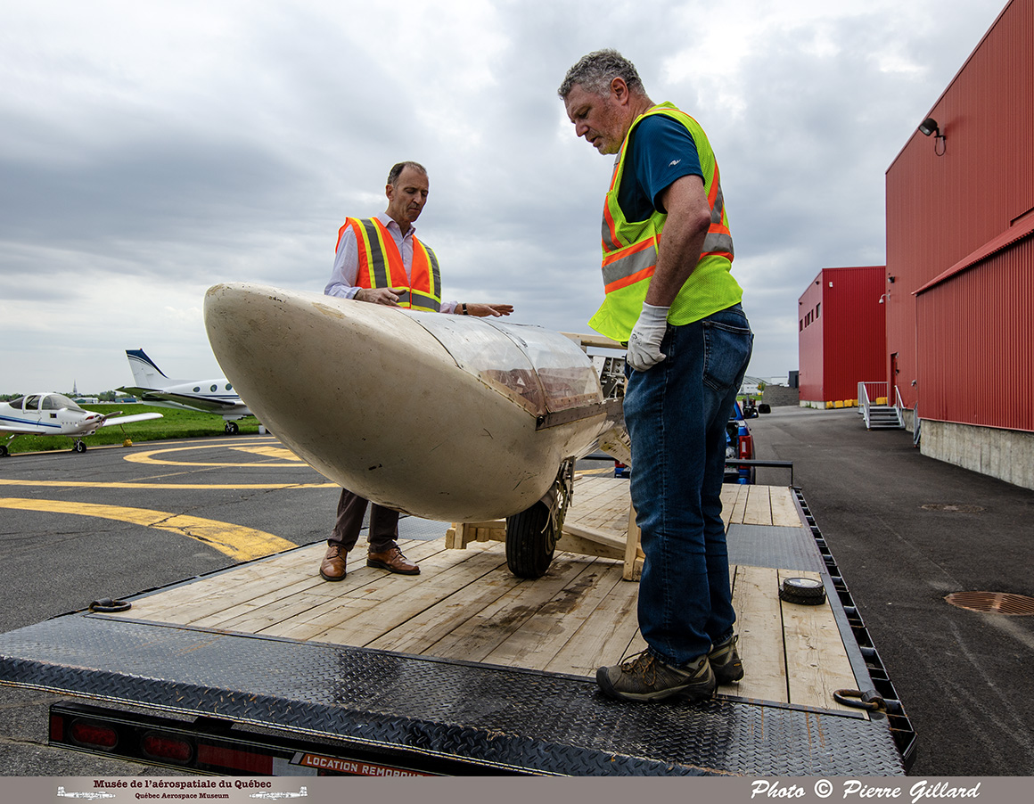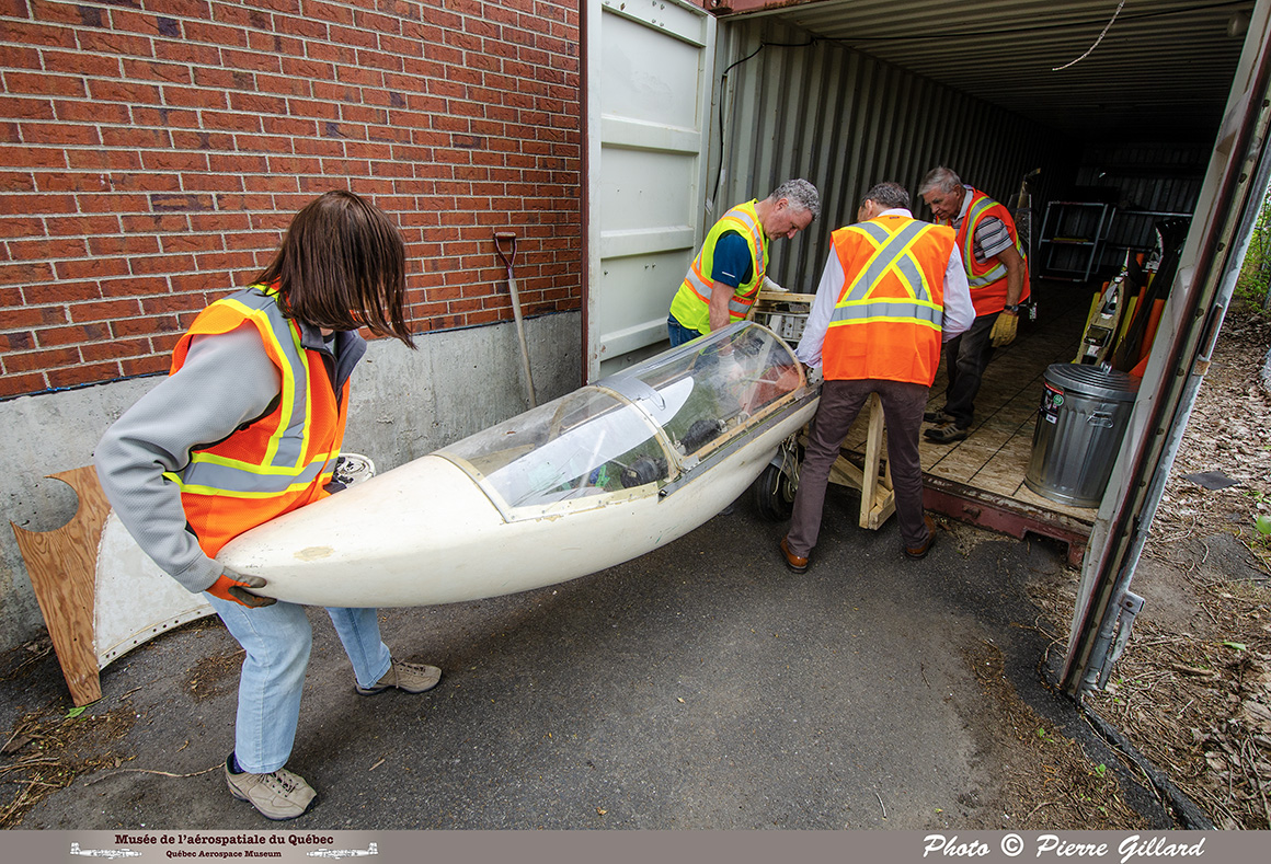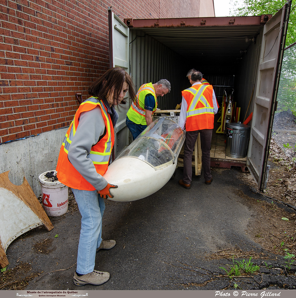 Puis, le fuselage est rangé dans le nouveau conteneur du MAQ situé sur la propriété de l’ÉNA. Mission accomplie; le planeur Mortensen 1PM C-GUOW, un appareil unique au monde, est désormais en sécurité et à l’abri. |