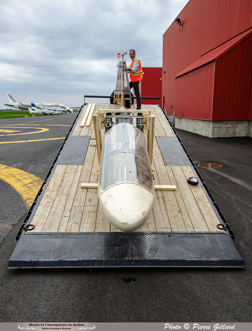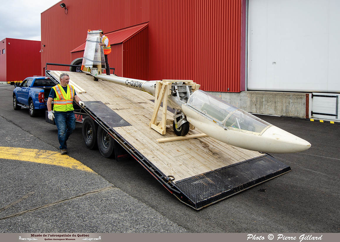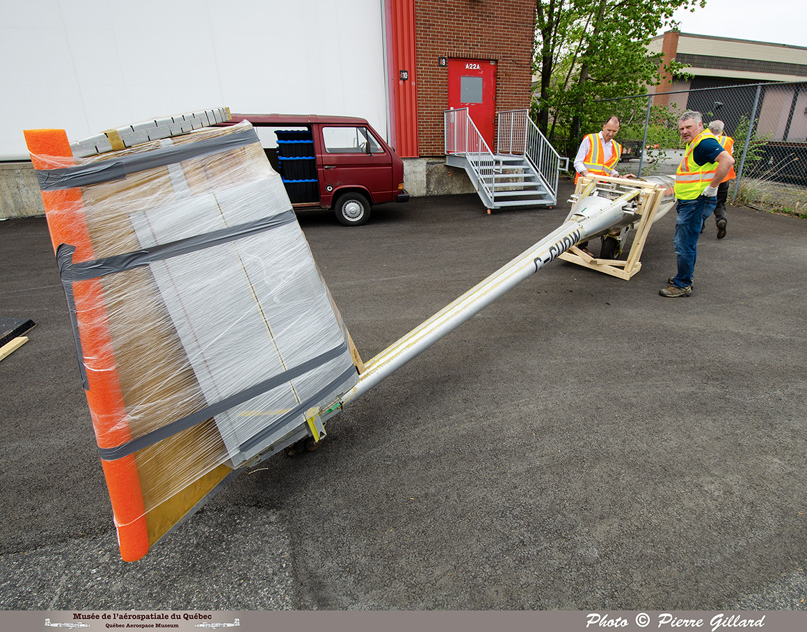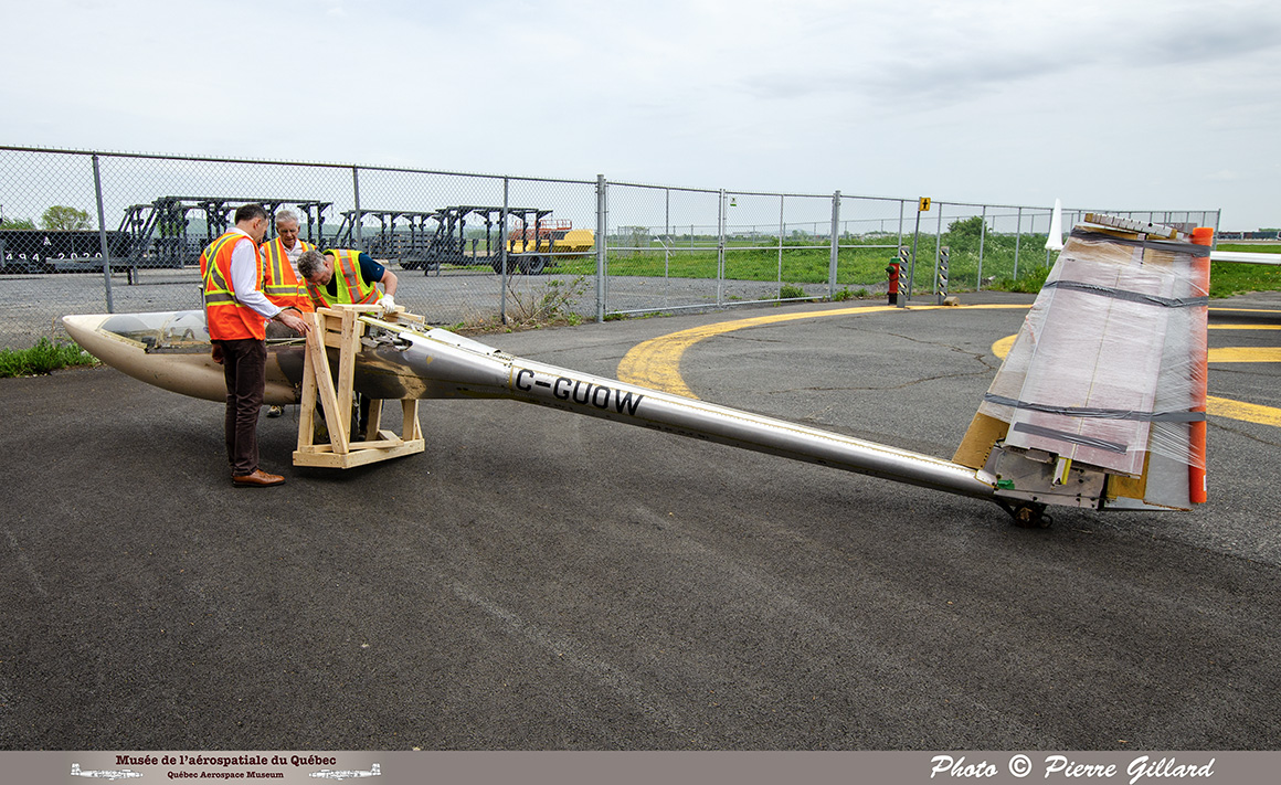 Puis, le fuselage est rangé dans le nouveau conteneur du MAQ situé sur la propriété de l’ÉNA. Mission accomplie; le planeur Mortensen 1PM C-GUOW, un appareil unique au monde, est désormais en sécurité et à l’abri. |
