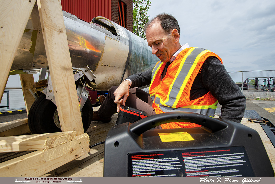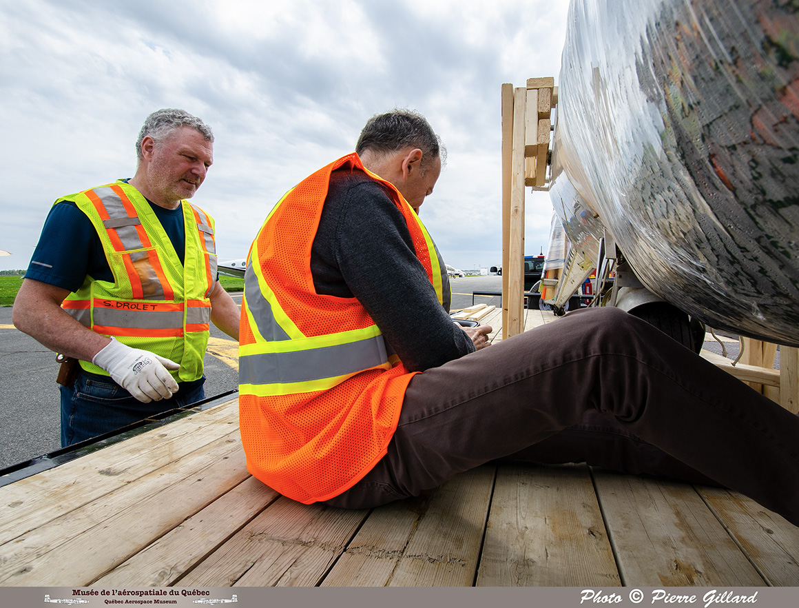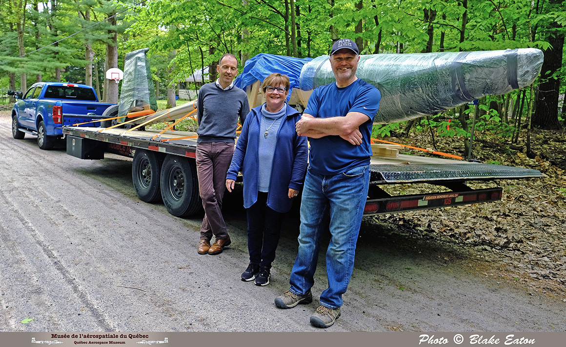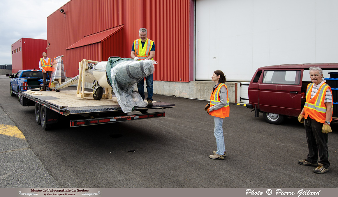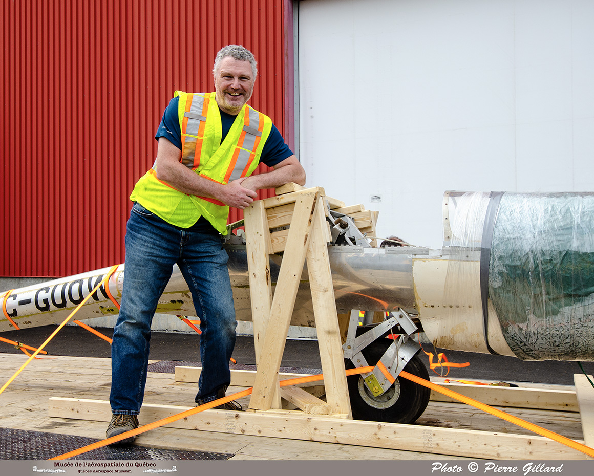 Puis, le fuselage est rangé dans le nouveau conteneur du MAQ situé sur la propriété de l’ÉNA. Mission accomplie; le planeur Mortensen 1PM C-GUOW, un appareil unique au monde, est désormais en sécurité et à l’abri. |