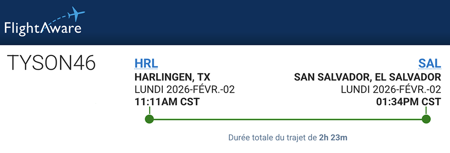C’est quasi certain qu’il s’agit d’un vol de déportés. Ceux-ci, devenus indésirables aux États-Unis, sont venus remplir les geôles salvadoriennes contre monnaie sonnante et trébuchante généreusement offerte par Donald et sa clique. En effet, le vol est originaire d’Harlingen au Texas d’où partent très régulièrement bon nombre de ces vols d’expulsion. |