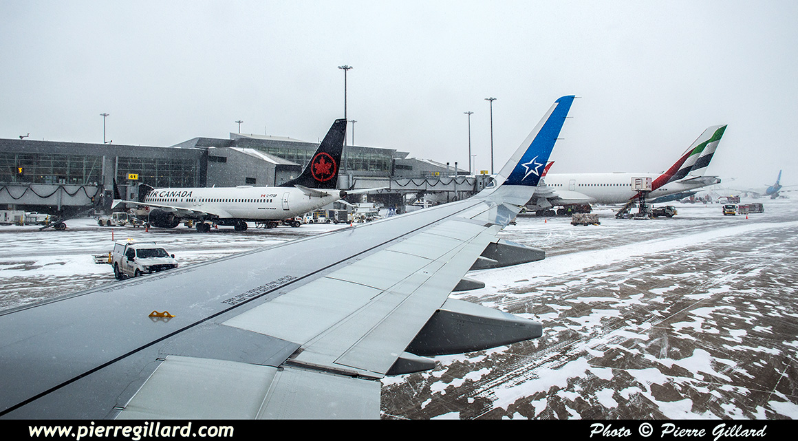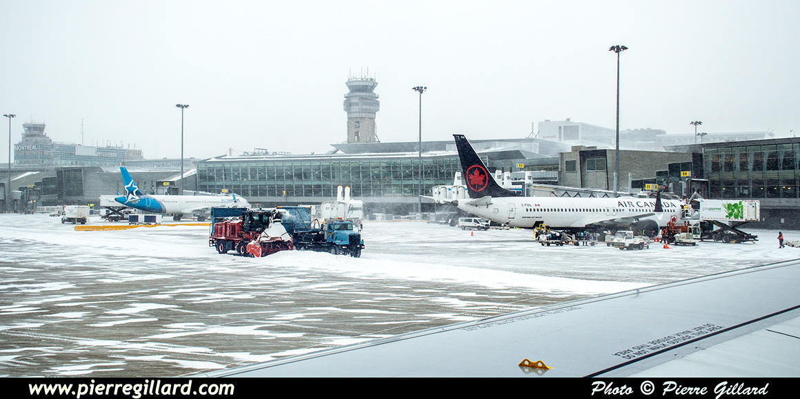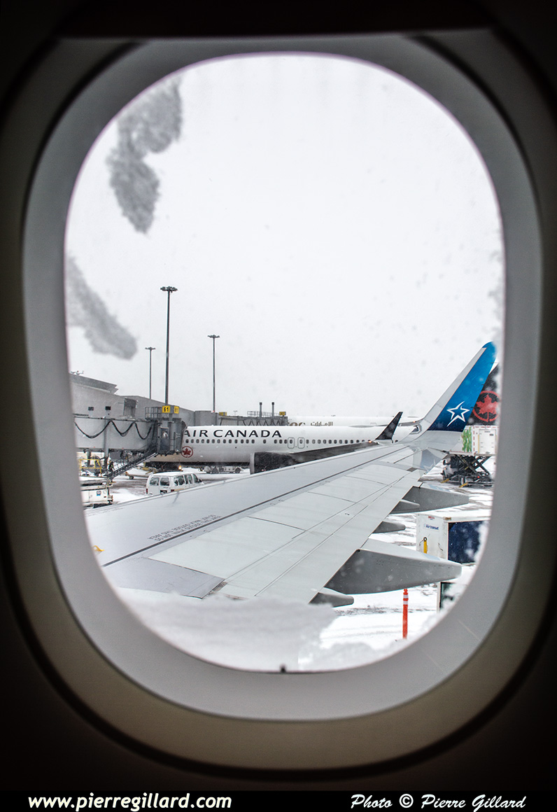 Notre chauffeur de taxi habituel, toujours prévoyant, arrive avec un peu plus d’avance que d’habitude. Nous quittons, donc, Longueuil sous une averse de neige vers 04h40, soit 20 minutes plus tôt que ce qui était prévu. Le trajet vers l’aéroport se déroule sans problème particulier, lentement mais sûrement. De la congestion sur l’autoroute 20 nous ralenti un peu, mais il n’est pas encore 06h00 que nous arrivons à Dorval, bien à temps pour notre vol toujours annoncé à 08h30. |