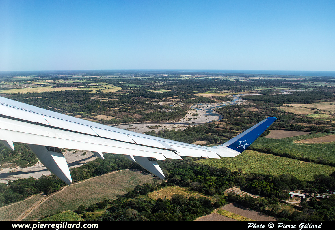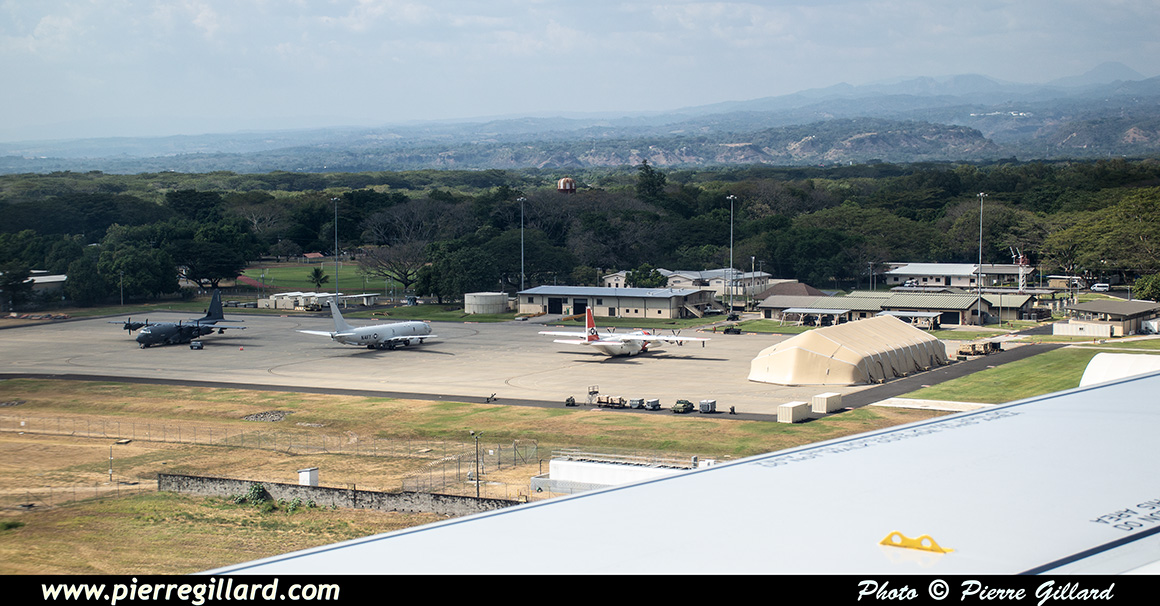 Le vol dure un peu moins de six heures. Puis c’est l’approche vers l’aéroport de San Salvador. En finale, je constate qu’il y a une petite base militaire américaine où je note un Boeing P-8A Poseidon de la U.S. Navy, un Lockheed HC-130J de la U.S. Coast Guard et un Lockheed AC-130J Ghostrider de la U.S. Air Force. Il est vrai que Donald s’entend bien avec le Salvador ... |