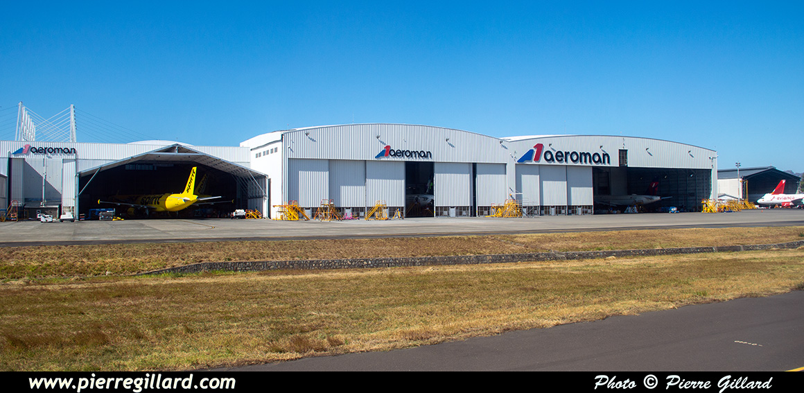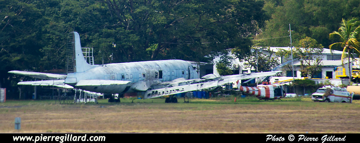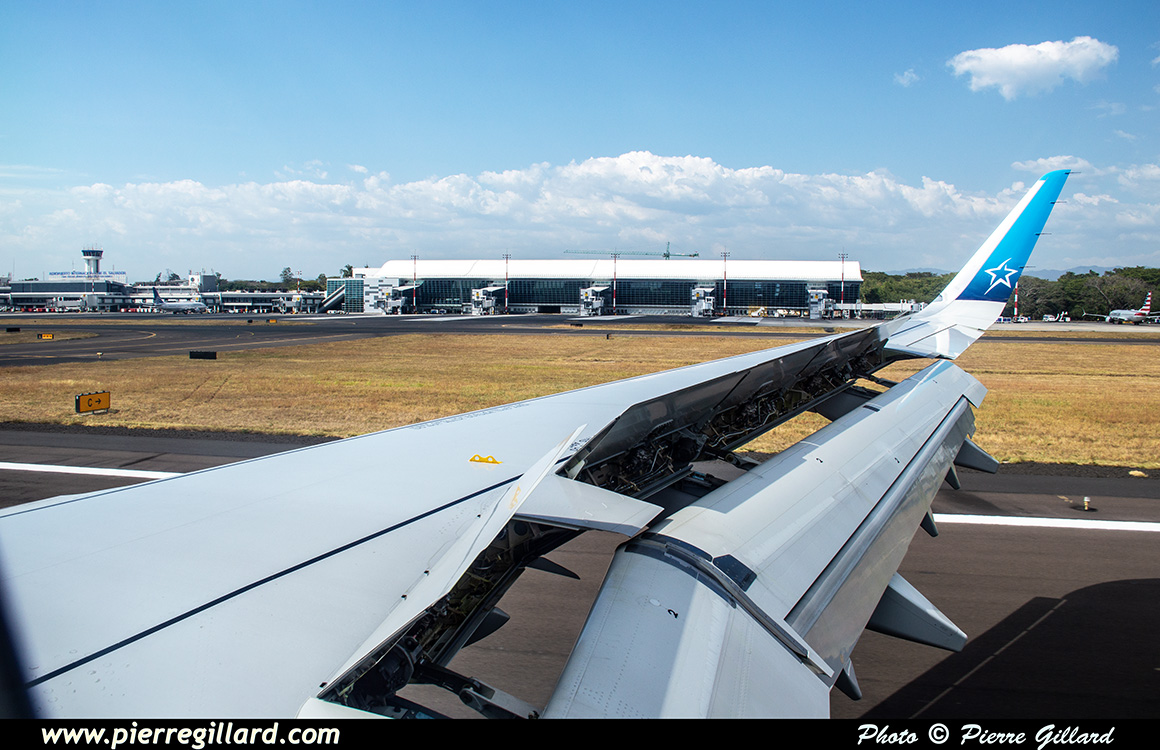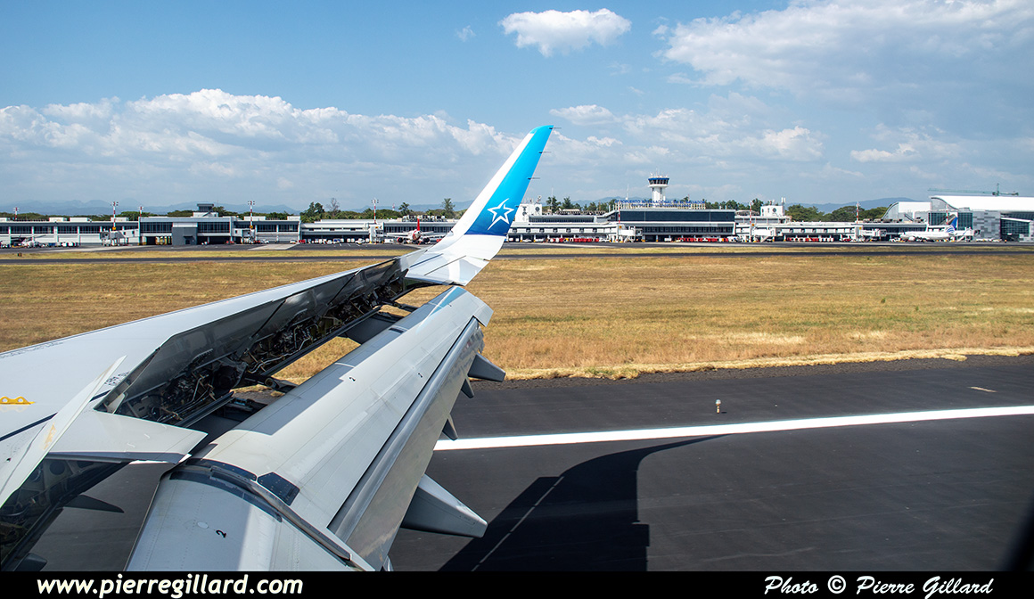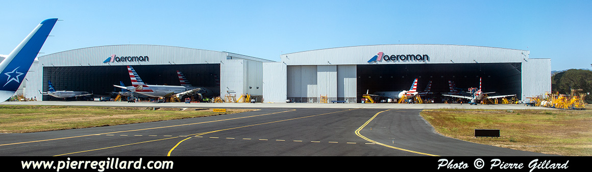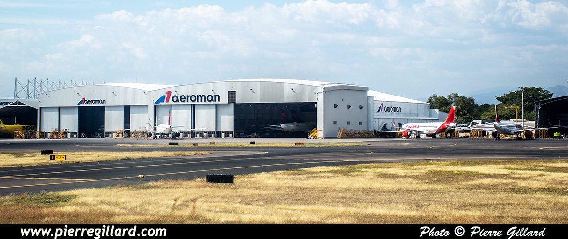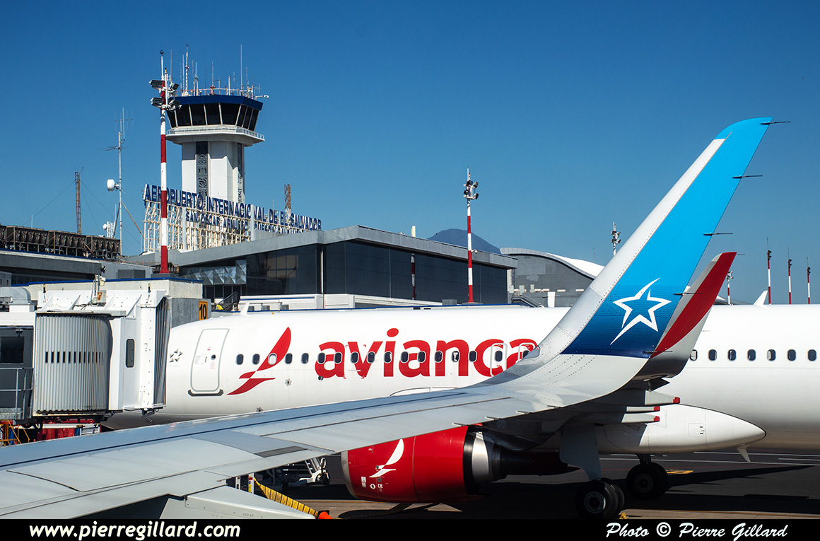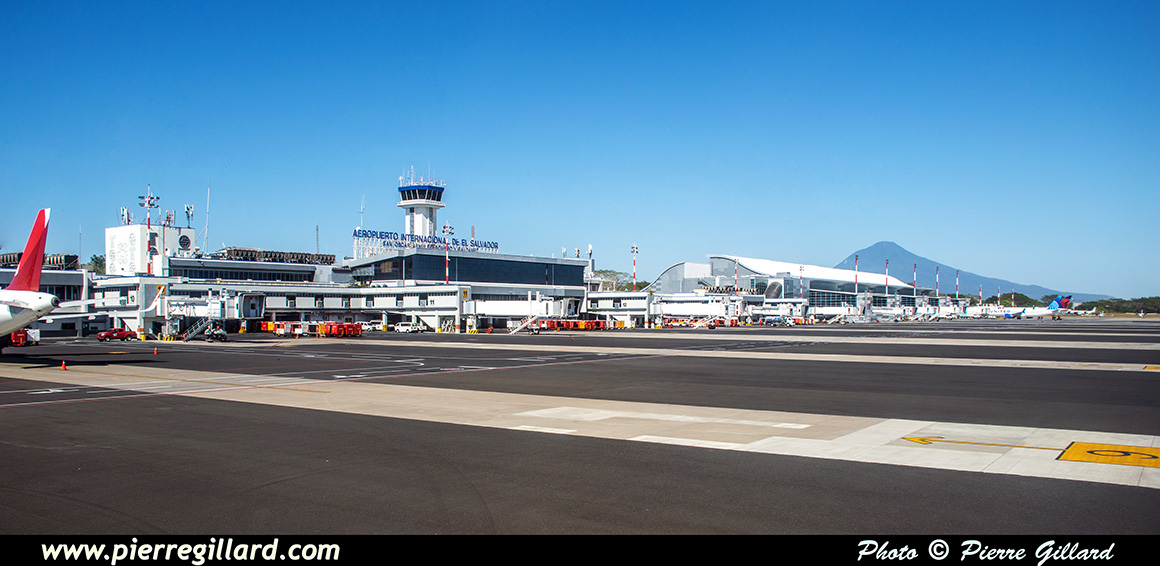 L’aérogare de l’aéroport international San Salvador Saint Óscar Arnulfo Romero y Galdámez est très grande, récente et très moderne. Lors de notre arrivée, seulement quelques avions se trouvent aux portes d’embarquement : un Boeing 737 d’Aeromexico qui est en train de partir, un Airbus A320 d’Avianca, un autre de Volaris, ainsi que quelques avions américains. Pour le reste, je note aussi plusieurs Airbus A320 d’Avianca près des hangars du MRO Aeroman, un ATR de FedEx et un DHC-6 Twin Otter tout blanc que je ne puis pas identifier. Il y a aussi une épave d’un DC-6 ainsi que celle d’un Bell UH-1 Iroquois. |