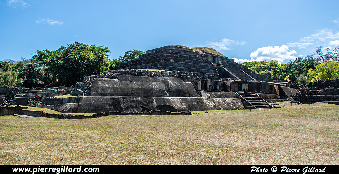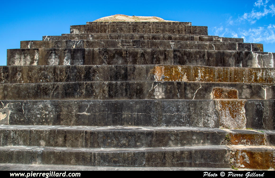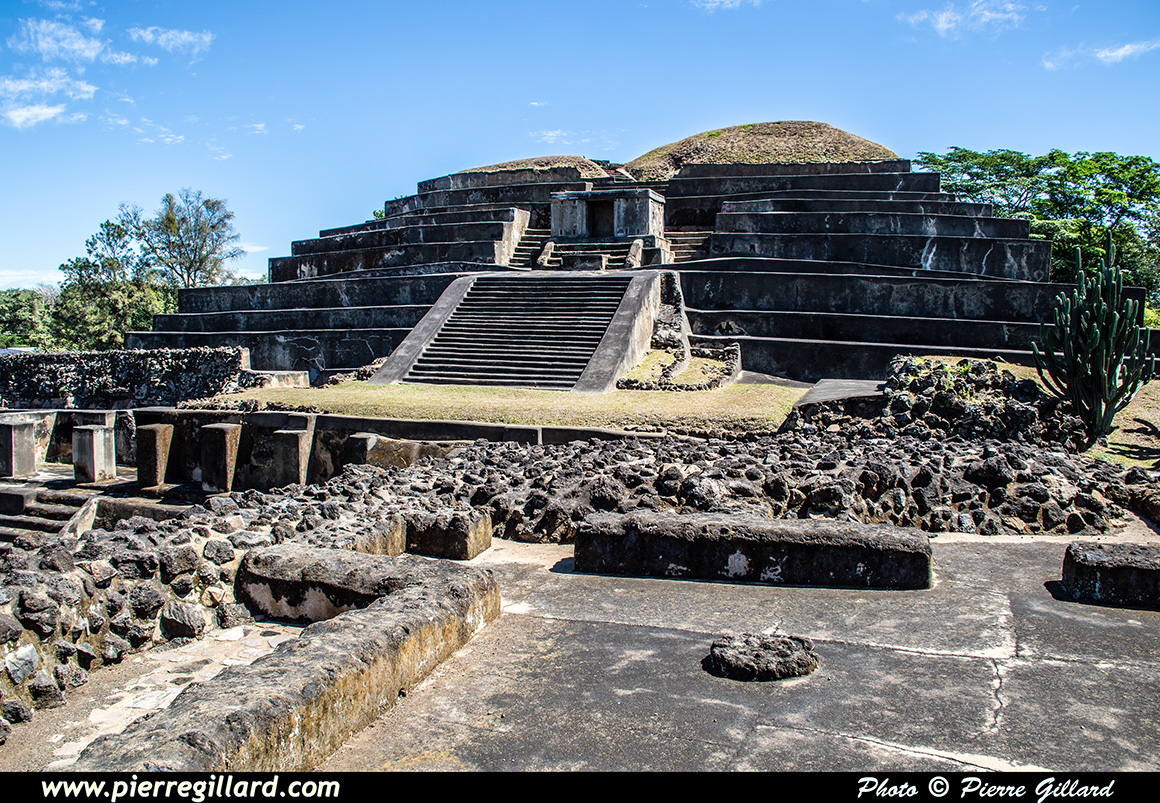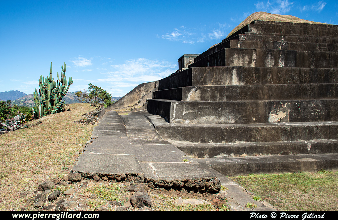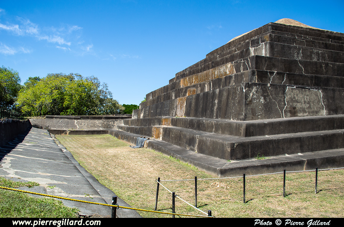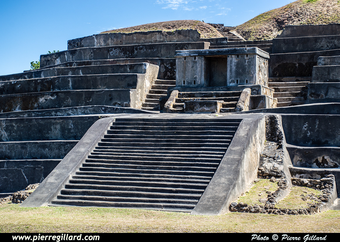 | La structure de la pyramide est rectangulaire et dispose d'un premier temple à l'étage intermédiare ainsi qu'un second au sommet - Parque Arqueológico Tazumal - 30-01-2026. |