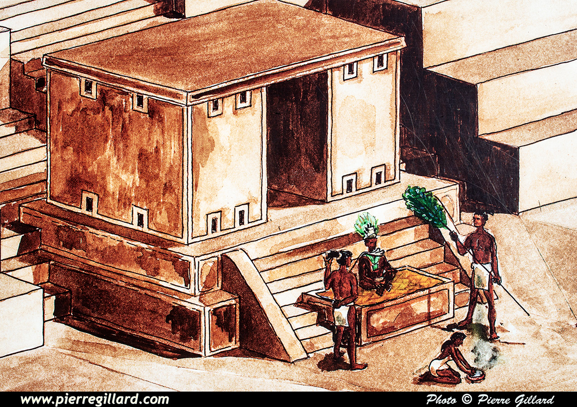 | Représentation d'une cérémonie religieuse se déroulant au petit temple de la pyramide - Parque Arqueológico Tazumal - 30-01-2026. |