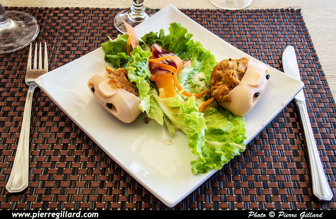 À l’hôtel Bambou, nous logeons dans un petit bungalow individuel très confortable entouré de végétation tropicale. Dans notre forfait, nous avons deux repas d’inclus à savoir le petit déjeuner et le souper sous forme de buffets. Ceux-ci sont les meilleurs que nous ayons jamais eus en vacances ex-aequo avec Haïti, quoique dans ce dernier cas, le choix de plats proposés était plus restreint (ce que l’on peut comprendre). |