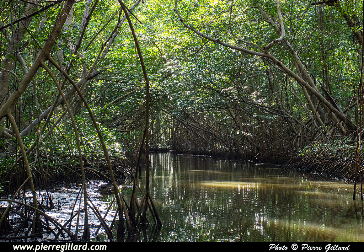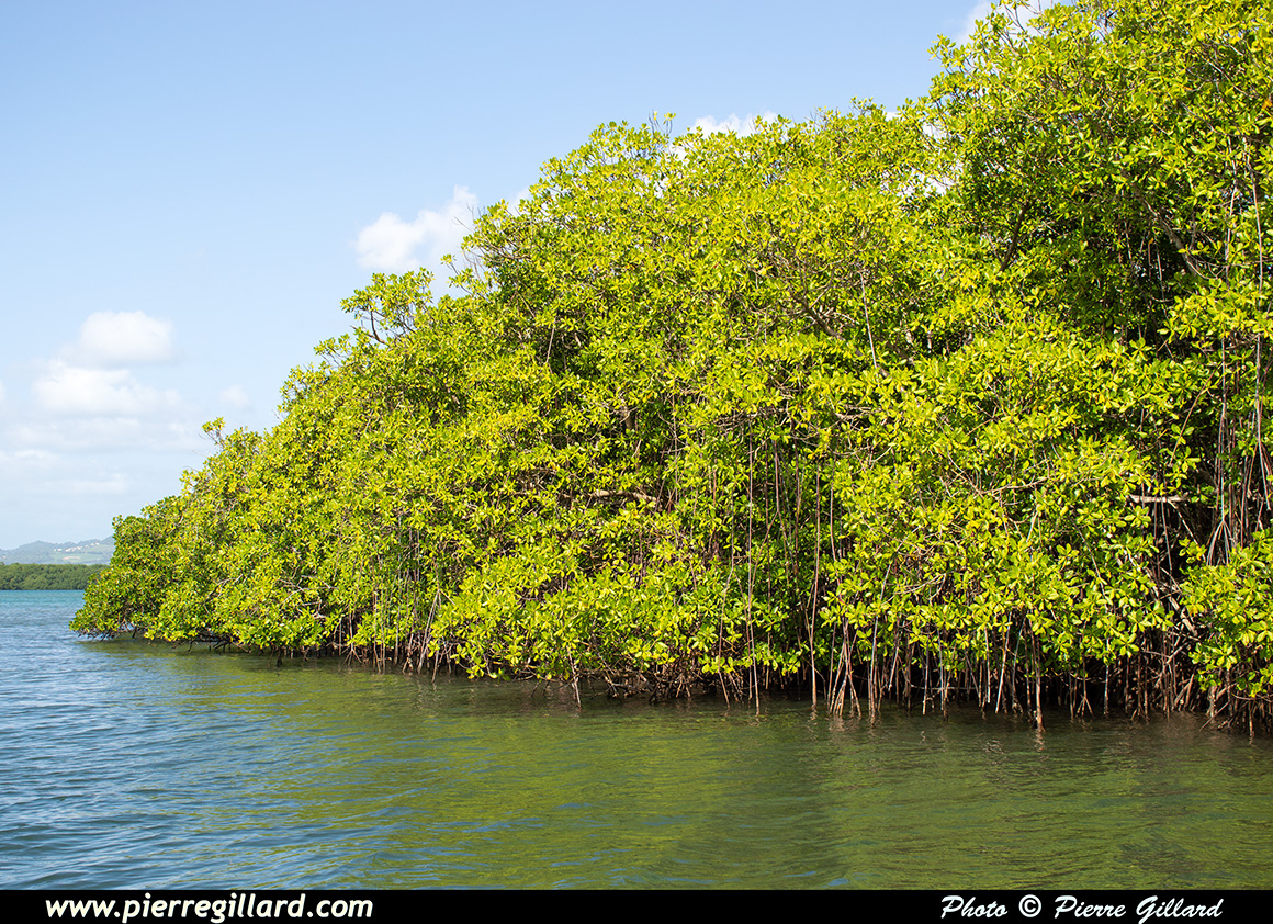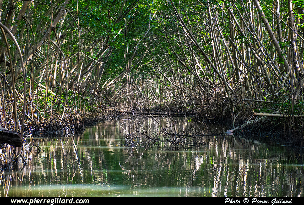 Nous sommes un groupe de 12 personnes, dont deux enfants, et notre guide n’est pas avare en commentaires et en explications. Nous passons à côté du Cayé à Vache, île nommée ainsi en souvenir des lamantins aujourd’hui disparus de l’île, ainsi qu’à côté du Petit-Îlet avant de nous enfoncer dans la mangrove proprement dite. |