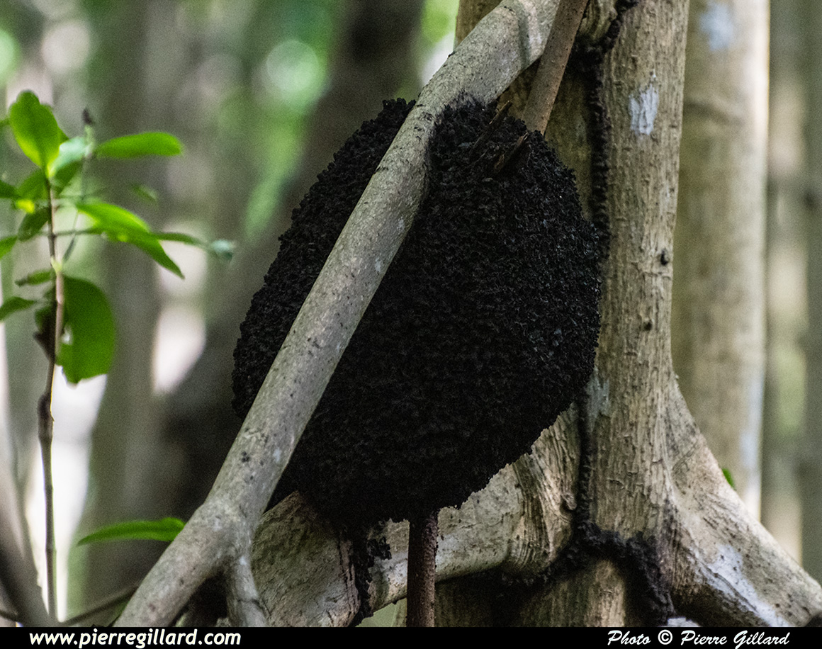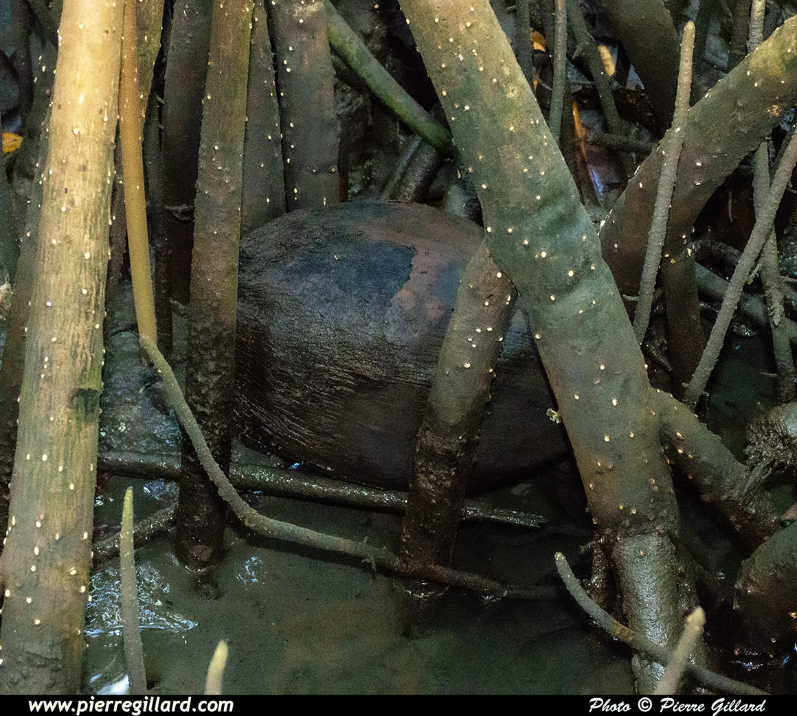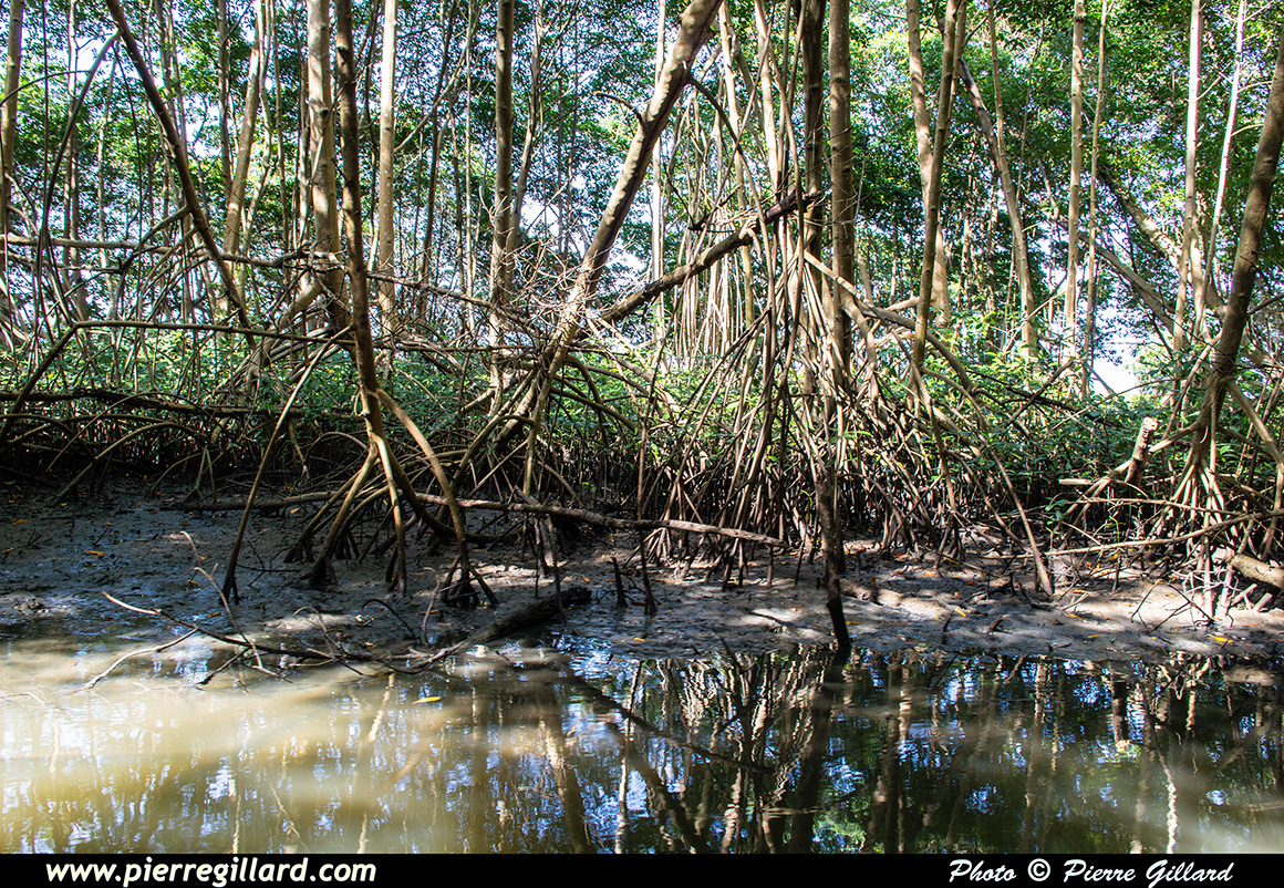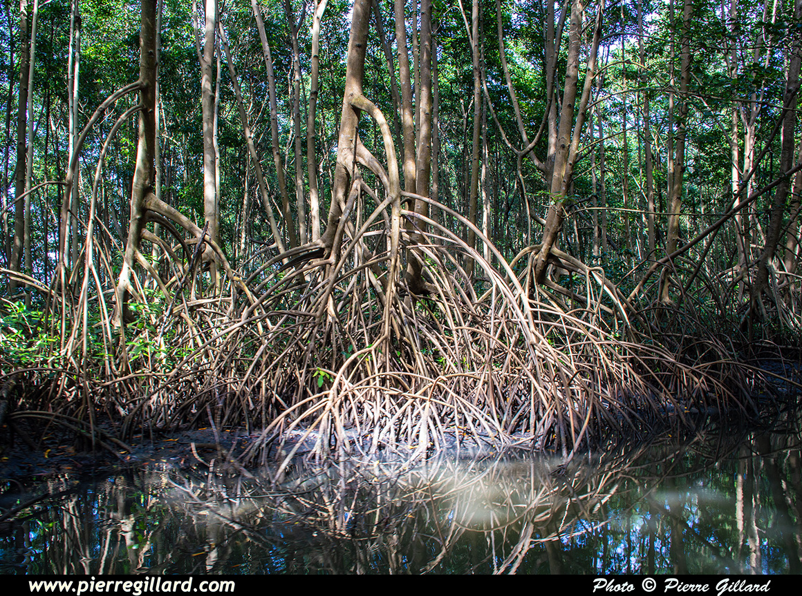 En chemin, nous pouvons apercevoir des crabes, des poules d’eau, une aigrette, des termitières, ainsi que les palétuviers avec leurs impressionnantes racines maintenant la base de leur tronc bien au-dessus du niveau de l’eau. |