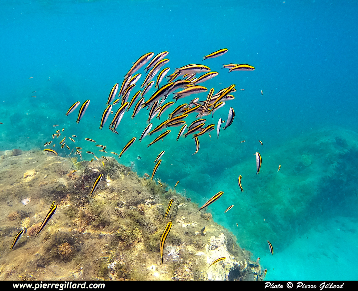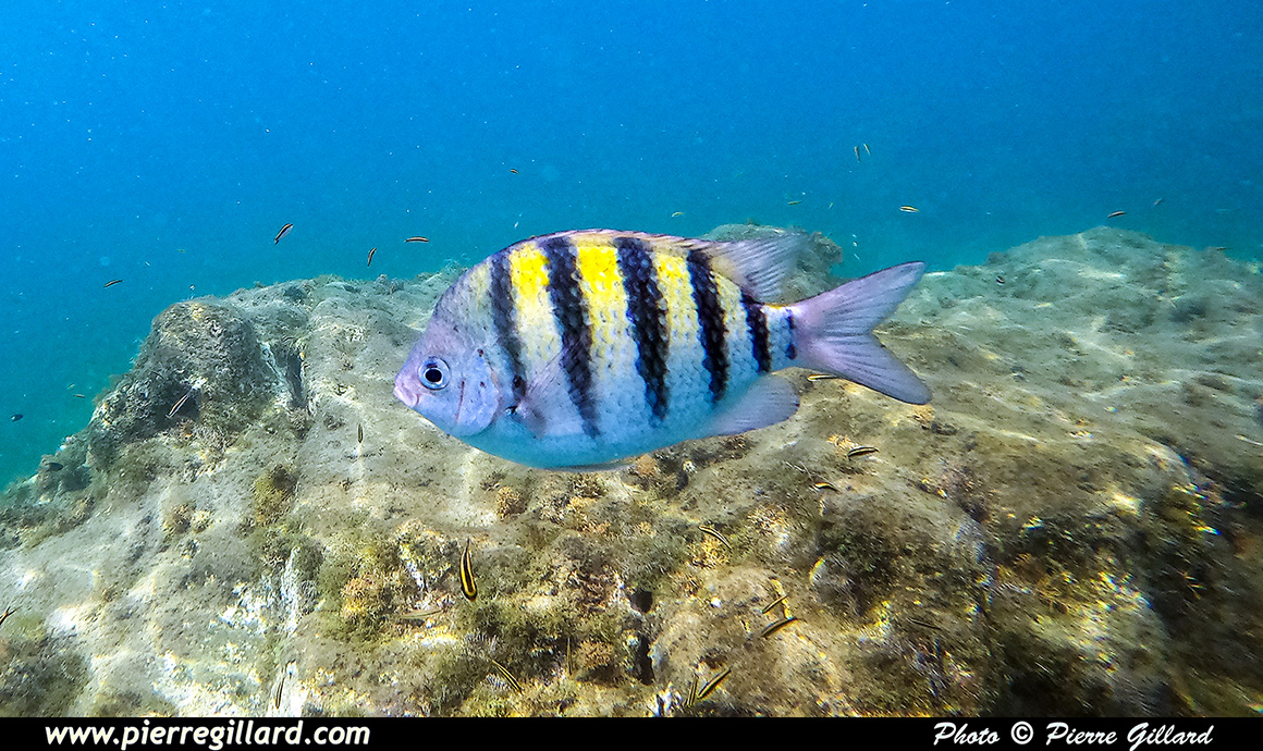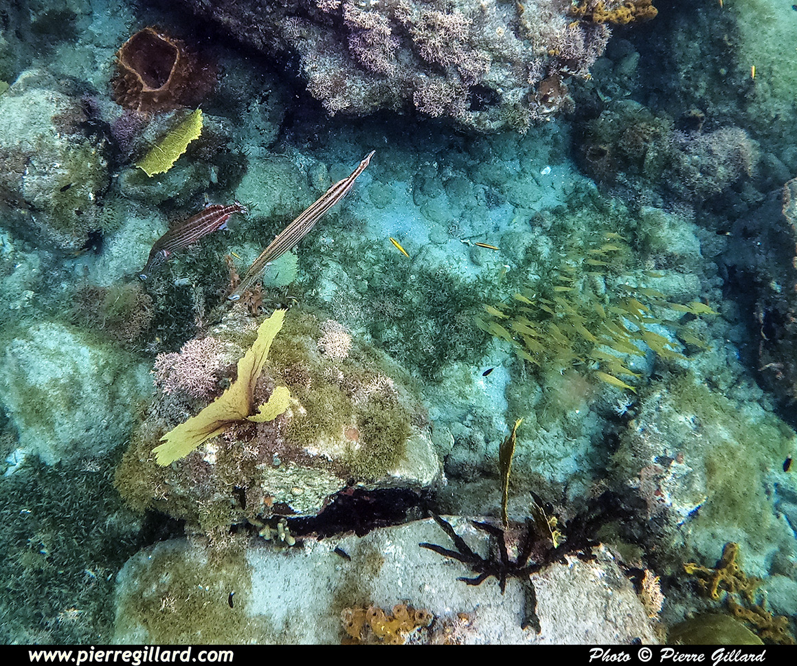En effet, même si le site est moins attirant que les massifs coralliens que j’ai eu l’occasion de voir à Haïti ou à Roatán au Honduras, la variété de poissons est néanmoins très intéressante. Et ces derniers, étant probablement habitués à la chose, n’ont vraiment pas peur de la présence humaine. En effet, par moments, je suis littéralement entouré de poissons multicolores. Il y en a même de minuscules que l’on peut uniquement apercevoir que lorsqu’il y a un reflet du soleil ! J’ai donc beaucoup de plaisir à "survoler" les petits massifs rocailleux autour desquels tournent la multitude des poissons. Parfois, j’effectue un "canard" afin de me rapprocher du fond situé à quatre ou cinq mètres, mais sans lest, on remonte très vite. |