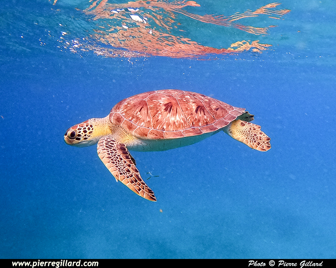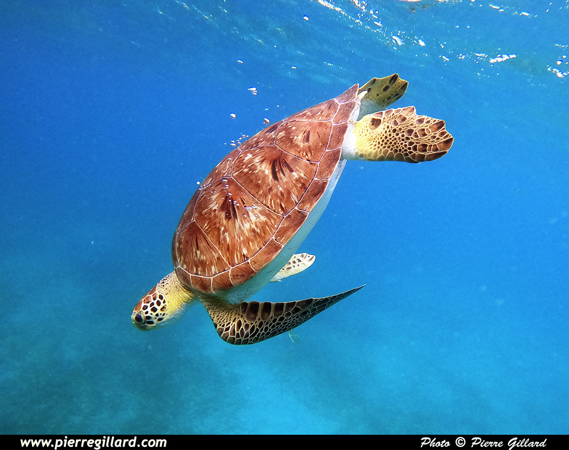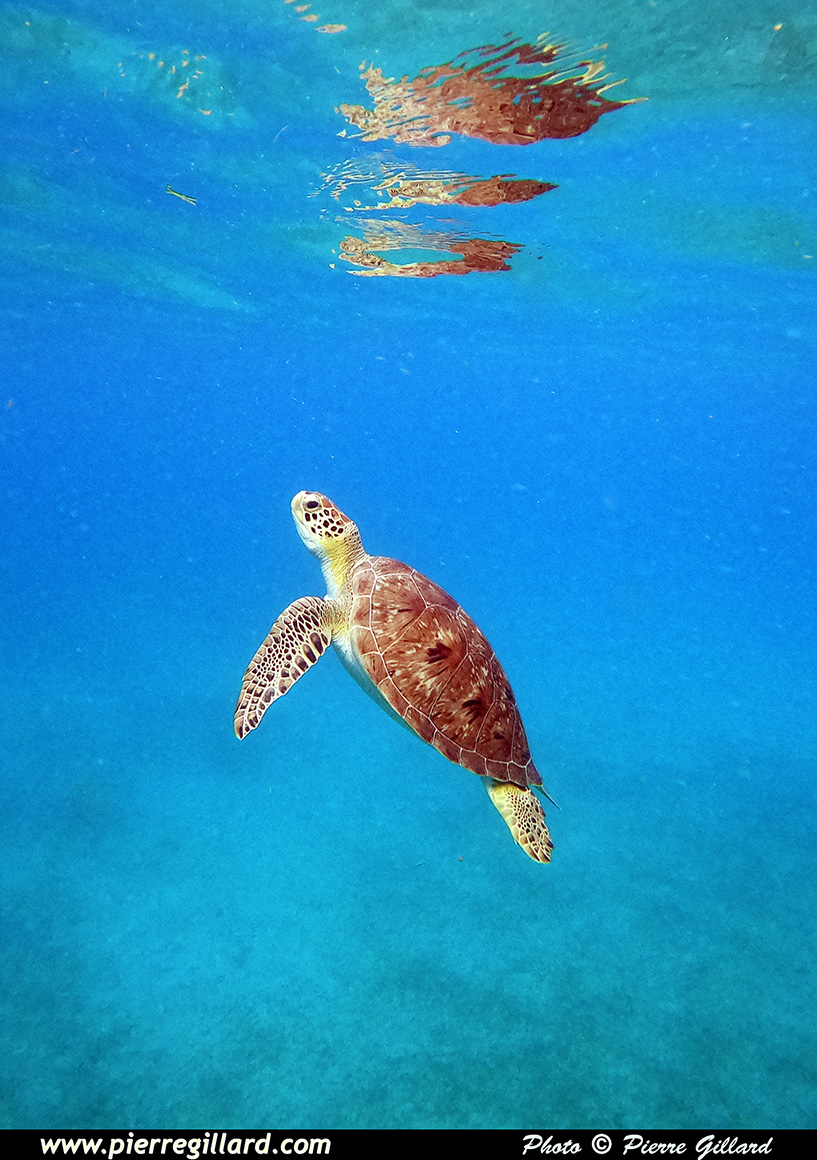C’est ainsi que, nullement impressionnée par ma présence, elle remonte tout juste à côté de moi et, surtout, de ma GoPro ! Quel moment extraordinaire … Celui-ci restera désormais gravé éternellement dans ma mémoire. Étant maintenant devenue "ma tortue" puisque je suis le seul à la suivre, je continue à nager au-dessus d’elle. Elle remontra encore deux autres fois pour mon plus grand bonheur. |