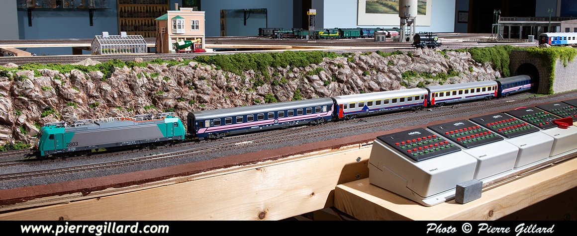 | Convoi de voitures de voyageurs composé des références Märklin # 43525, 4351, 42742 et 42741 tracté par la locomotive électrique série 28 Märklin # 36608 - Longueuil, QC - 07-04-2026. |