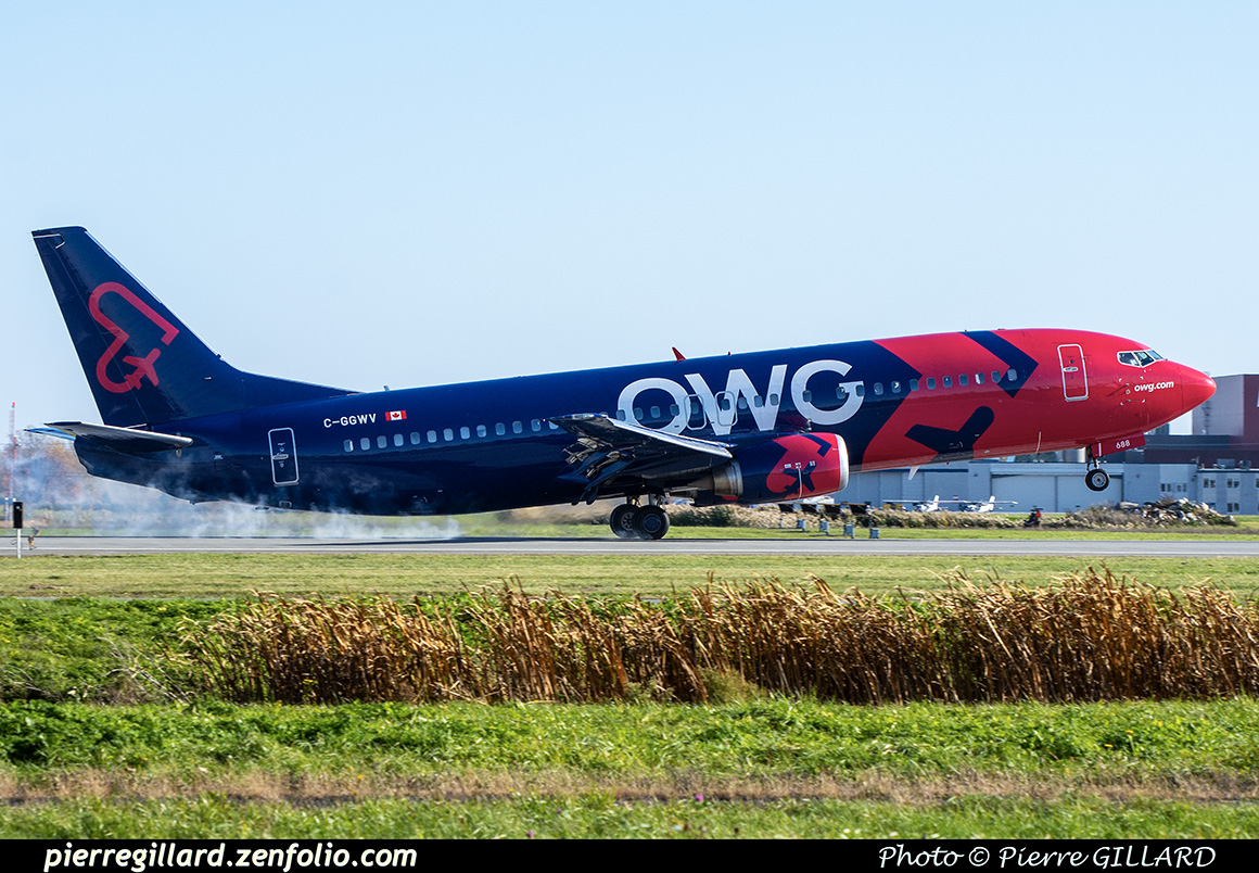 Cet après-midi, toute notre petite équipe de spotters "parasites de l’aéroport de Saint-Hubert" étions à poste afin de photographier l’arrivée de l’équipe de football des Argonauts de Toronto. En fait, ce n’était pas vraiment l’équipe en question qui nous intéressait, mais plutôt le Boeing 737-4Y0 C-GGWV (ex-OO-VEO pour mes amis belges) d’OWG, la filiale de Nolinor, qui la transportait ! Alors voici quelques photos de l’arrivée de l’avion au HUB FBO sous une magnifique lumière d’automne. |