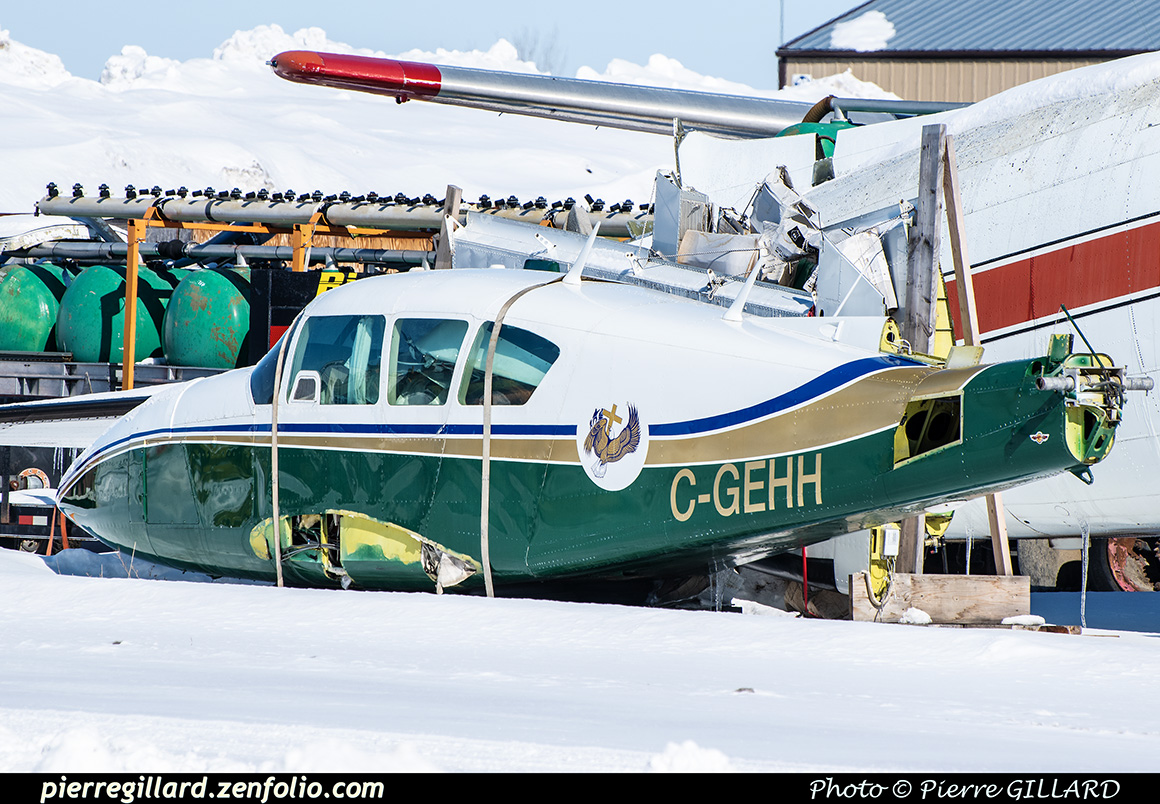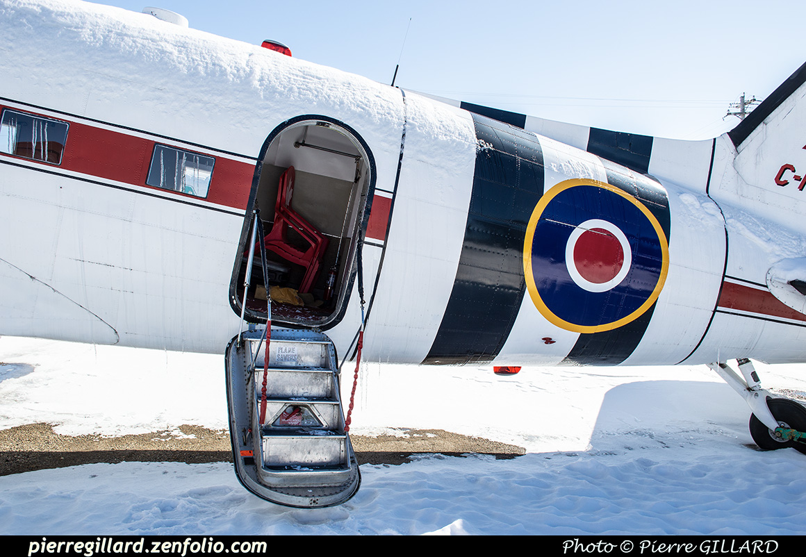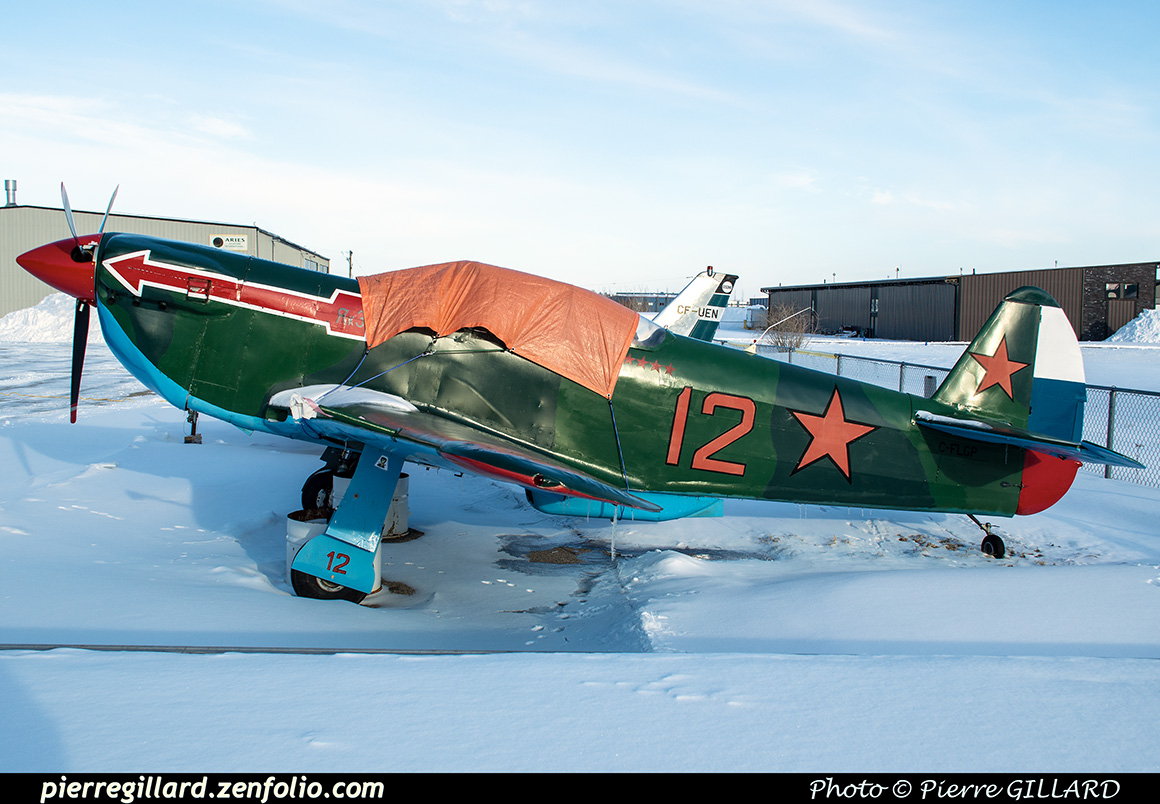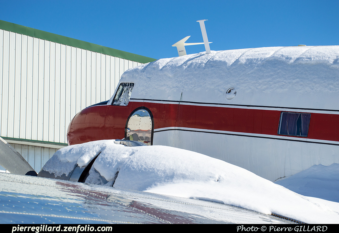 Après la visite des musées militaires, en route vers notre hôtel à Cochrane, nous nous devons de faire le tour de ce vaste aéroport. Étant l’hiver et sous la neige, il n’y a pas beaucoup d’activités et de mouvements. Nous prenons, donc, ça et là quelques photos des avions situés à proximité des clôtures. Parmi les "pièces plus rares", nous pouvons voir un Beechcraft Duke (C-FBQC), un Cessna 303 Crusader (N303AB), un fuselage d’Ercoupe (C-FMMS) ainsi qu’une réplique d’un Yak (C-FLGP) en construction amateur. |