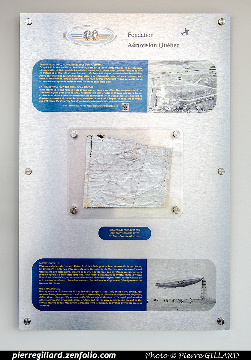 La murale comprend un morceau de toile de l’enveloppe du R-100 provenant de la collection privée du Dr. Jean-Claude Marcoux. N’ayant pu assister à l’inauguration, car étant en cours à l’ÉNA au même moment, j’ai toutefois eu l’occasion de photographier hier cette très belle présentation murale désormais exposée au HUB FBO. |