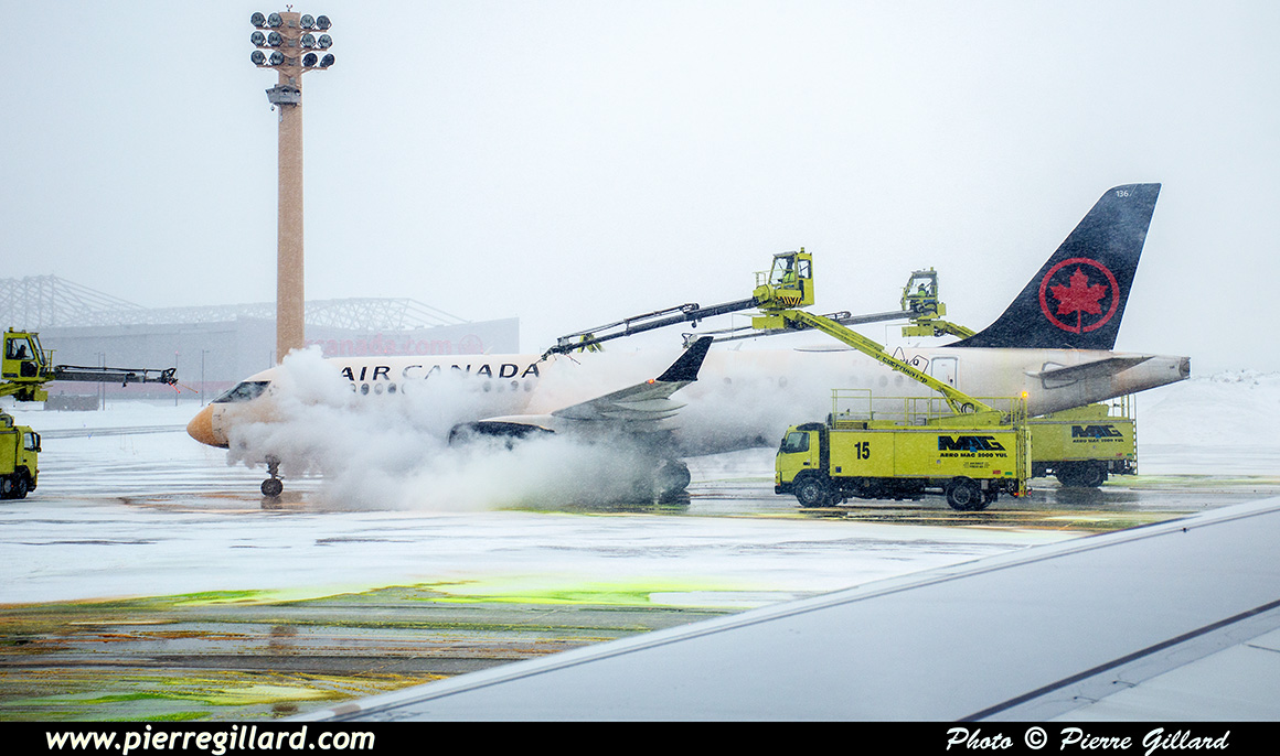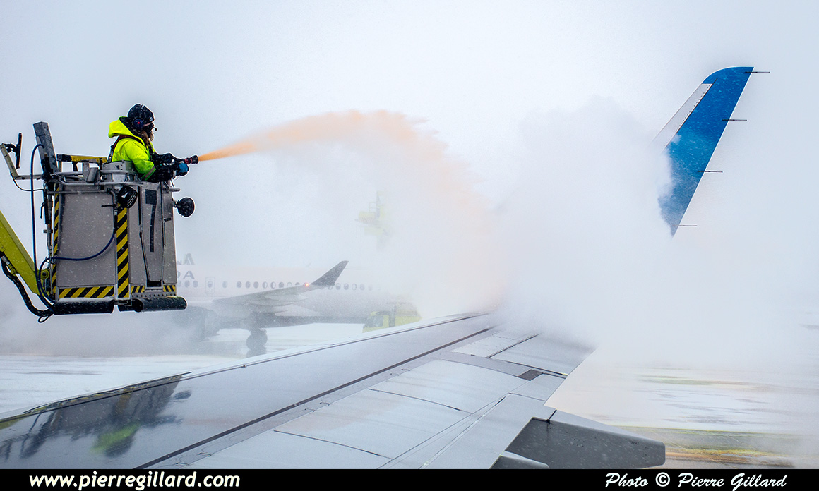 Le refoulement (pushback) débute avec dix minutes de retard sur l’horaire. Dehors, la tempête de neige perdure et nous nous rendons maintenant au dégivrage. Assis au siège 22K situé à hauteur du bord de fuite de l’aile, j’assiste au début de l’opération jusqu’à ce que mon hublot soit couvert de produit déglaçant ! |