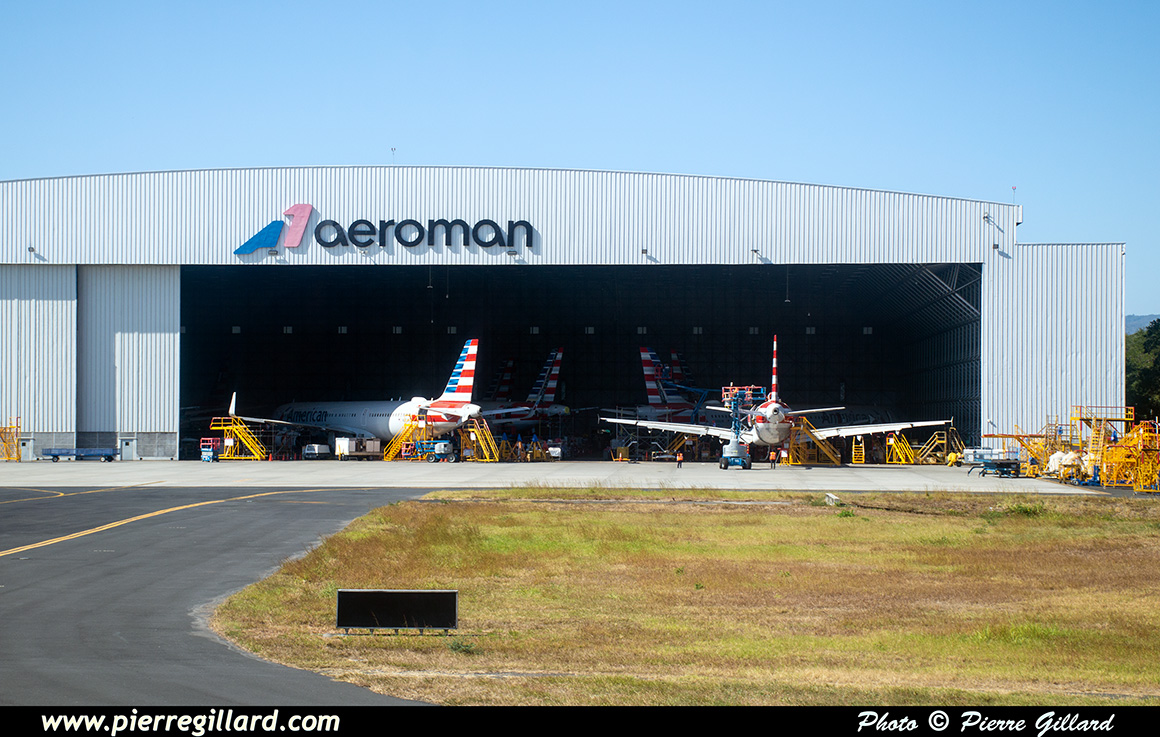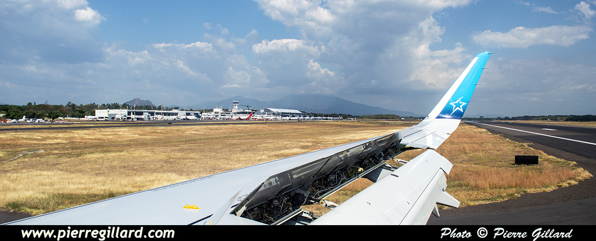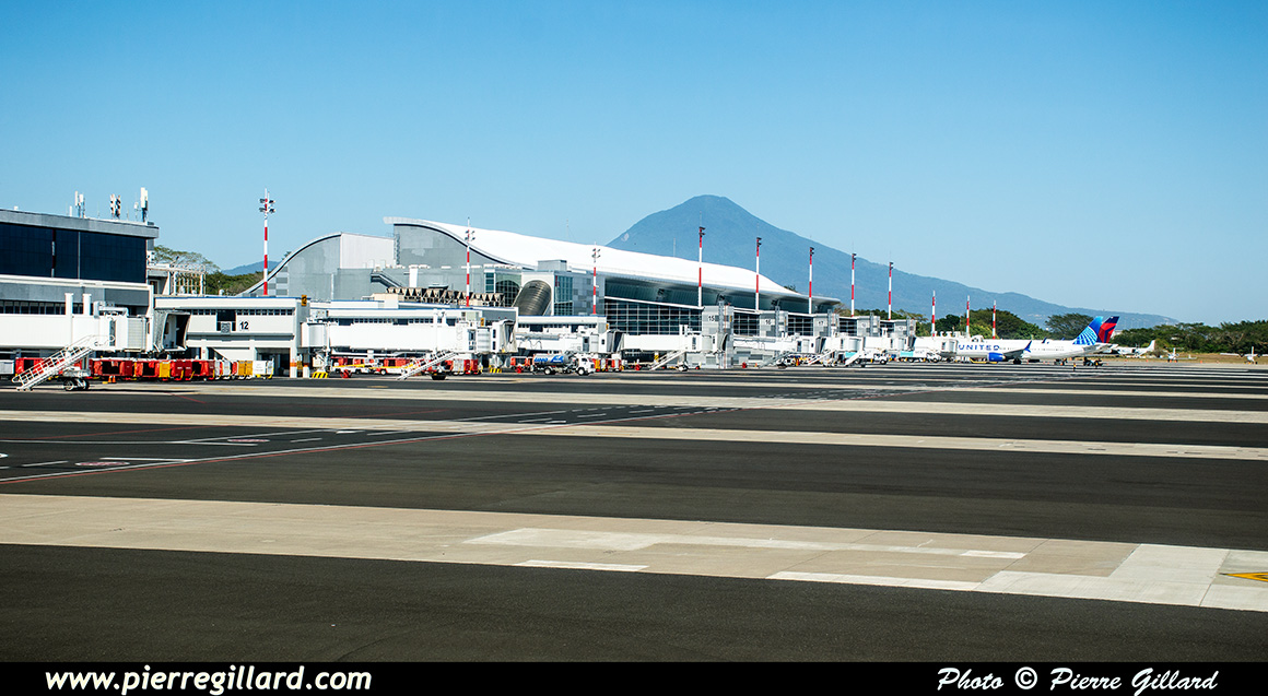 L’aérogare de l’aéroport international San Salvador Saint Óscar Arnulfo Romero y Galdámez est très grande, récente et très moderne. Lors de notre arrivée, seulement quelques avions se trouvent aux portes d’embarquement : un Boeing 737 d’Aeromexico qui est en train de partir, un Airbus A320 d’Avianca, un autre de Volaris, ainsi que quelques avions américains. Pour le reste, je note aussi plusieurs Airbus A320 d’Avianca près des hangars du MRO Aeroman, un ATR de FedEx et un DHC-6 Twin Otter tout blanc que je ne puis pas identifier. Il y a aussi une épave d’un DC-6 ainsi que celle d’un Bell UH-1 Iroquois. |