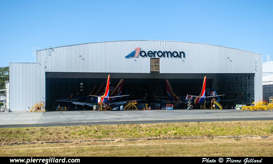 Notre avion est, quant à lui, l’Airbus A321neo C-GOKC. L’embarquement se déroule sans problème et le refoulement a lieu 12 minutes en avance sur l’horaire. Lorsque nous nous rendons vers la piste de décollage, nous longeons les impressionnantes installations du MRO Aeroman. Un des hangars ne contient pas moins de huit Boeing 737 de Southwest et un autre six Airbus de la famille A320 d’American Airlines ! |