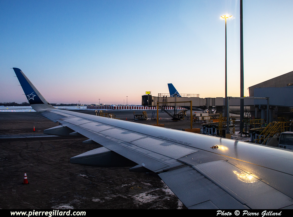 | Le jour se lève à Dorval alors que l'embarquement est terminé et que nous sommes prêts à partir - C-GOIR Airbus A321-271NX (A321neo) MSN 10866, Air Transat - Vol TS738 entre YUL et FDF - Montréal-Pierre-Elliott-Trudeau (Dorval), QC - CYUL - 22-02-2026. |