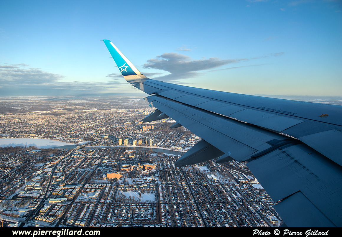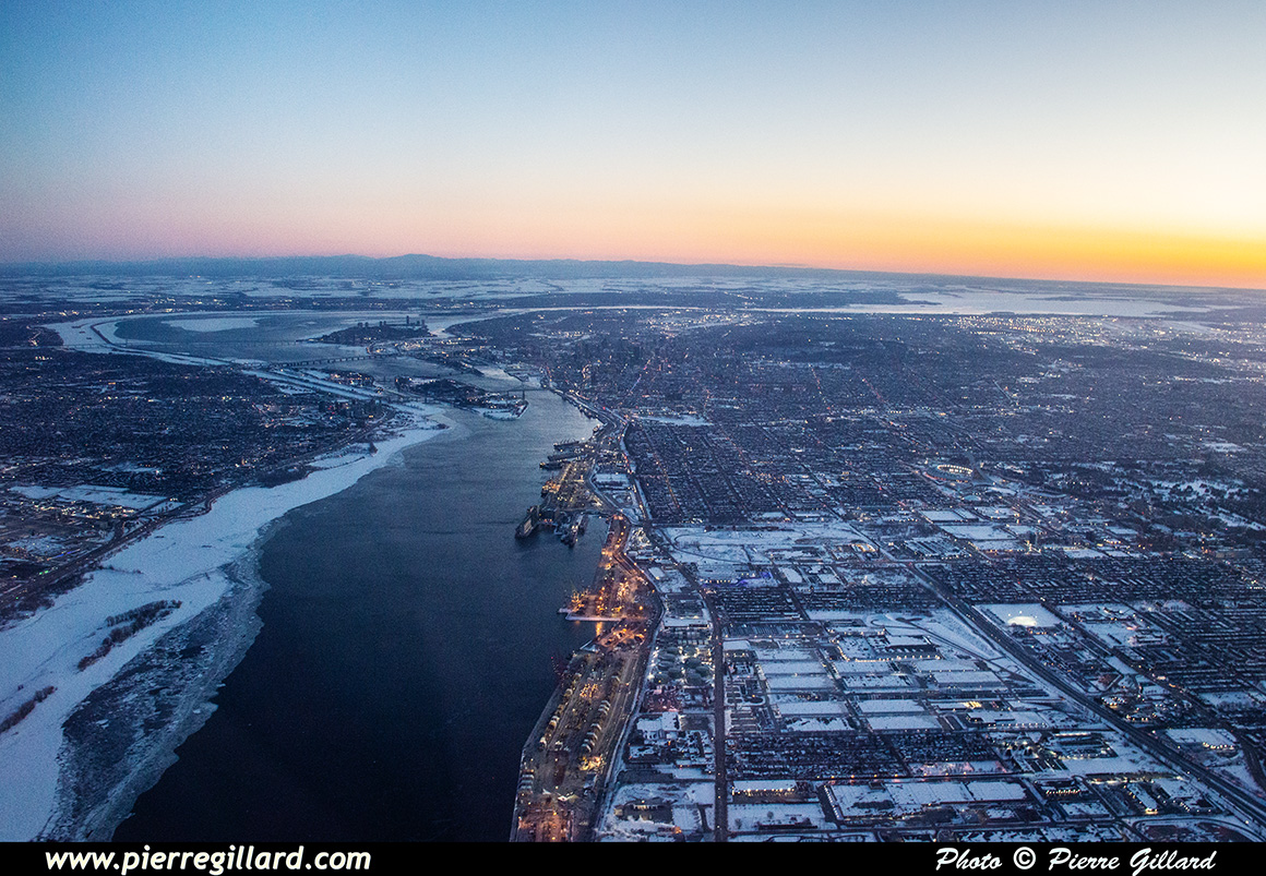 Lorsque nous arrivons à proximité de Montréal, le soleil vient tout juste de se coucher, ce qui donne une lumière intéressante pour le photographe. J’en profite donc pour prendre quelques vues aériennes aux dernières lueurs du jour. |