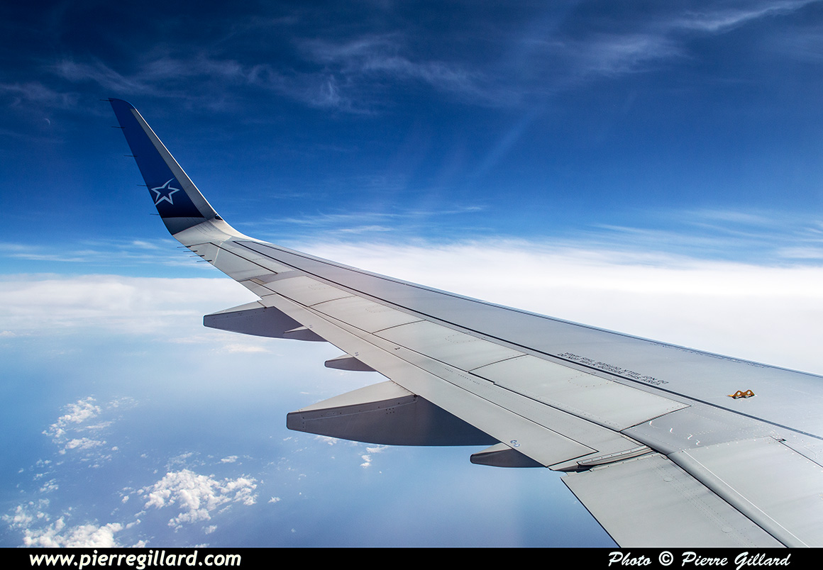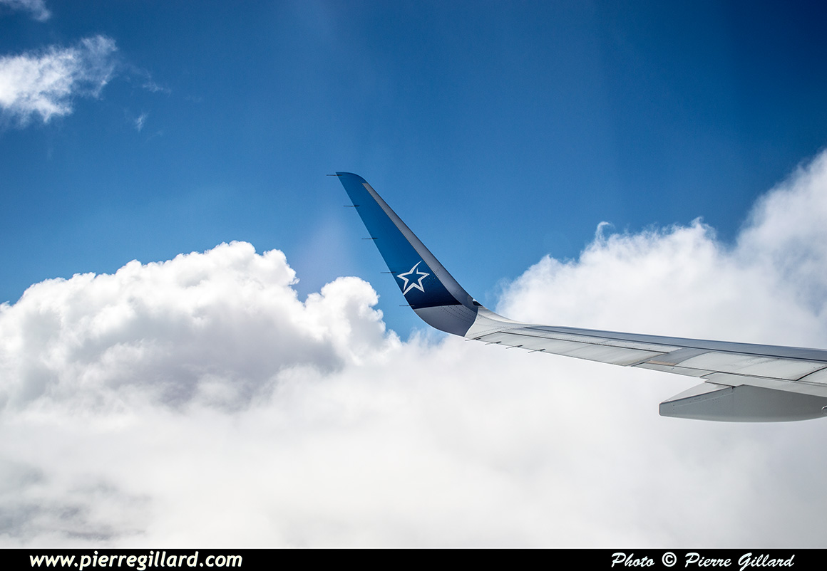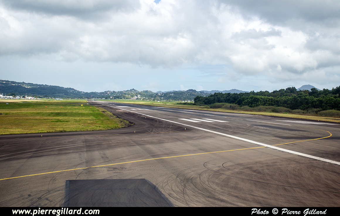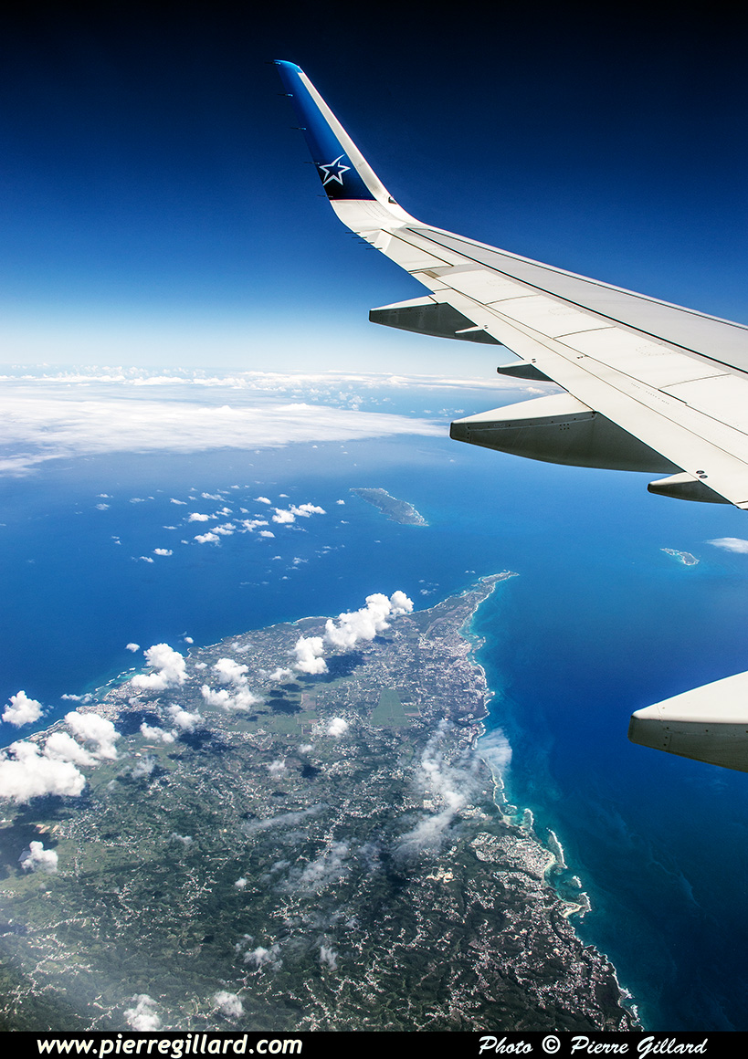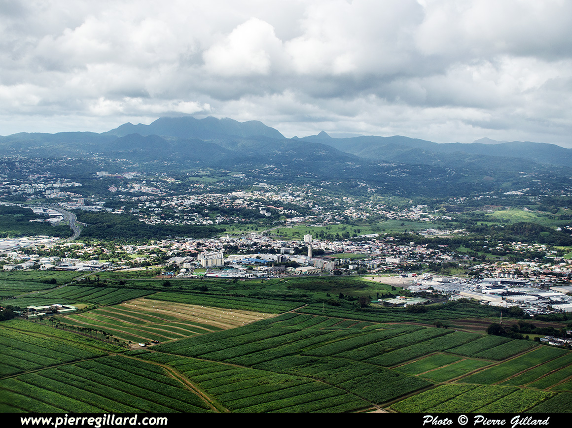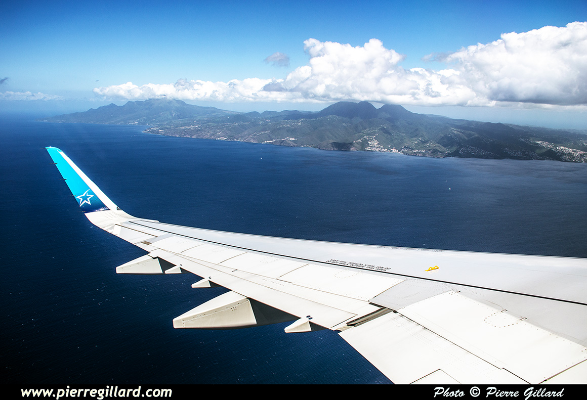 Nous commençons notre descente vers l’aéroport Aimée-Césaire de Fort-de-France au-dessus de la Guadeloupe et de Marie-Galante. L'approche se poursuit en survolant la Dominique, une île essentiellement couverte de forêts. Puis nous arrivons en vue de la Martinique reconnaissable par la Montagne Pelée dont le sommet est quasi toujours dans les nuages. |
