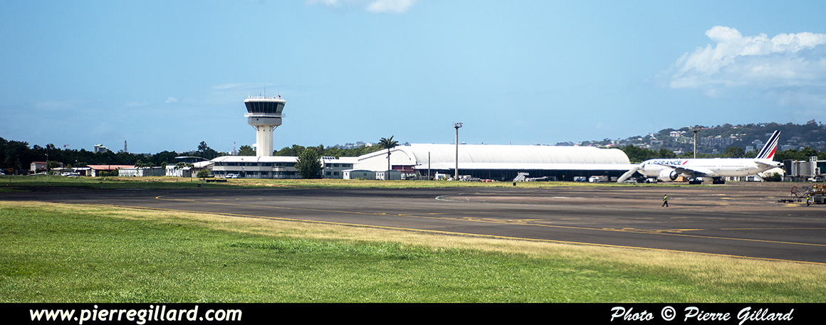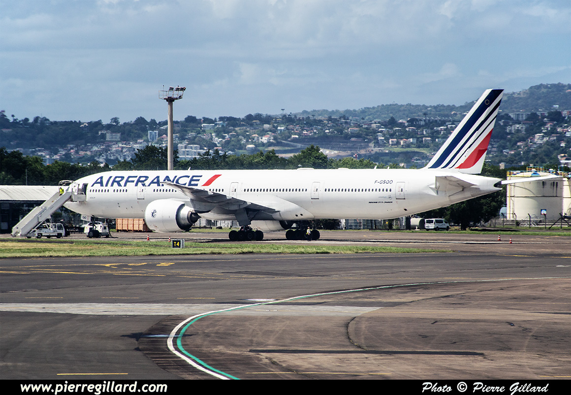 Un peu à l’écart de l’aérogare se trouve le Boeing 777-328(ER) F-GSQO d'Air France. Il est stationné à cet endroit car, la veille, après avoir décollé de Fort-de-France, il a eu un sérieux problème sur un de ses moteurs et a dû revenir se poser. Il est donc immobilisé depuis en attendant sa réparation. |
