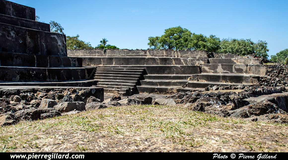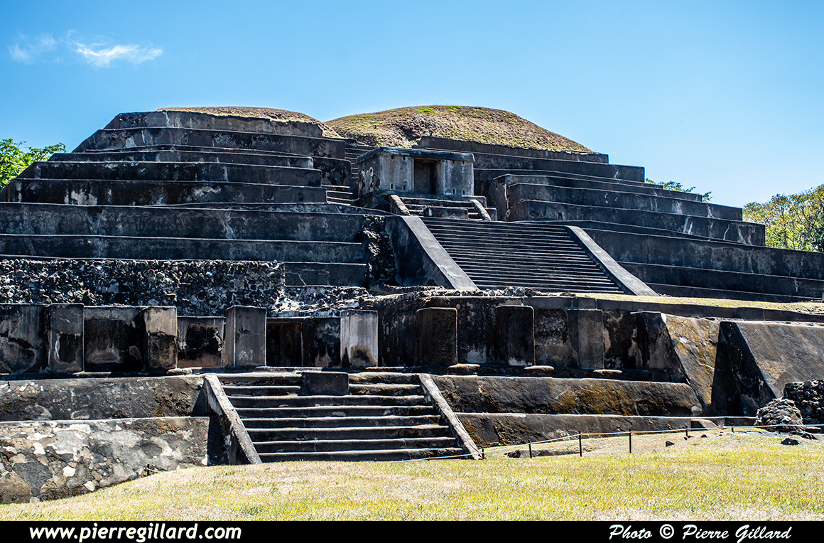 | La structure de la pyramide est rectangulaire et dispose d'un premier temple à l'étage intermédiare ainsi qu'un second au sommet - Parque Arqueológico Tazumal - 30-01-2026. |