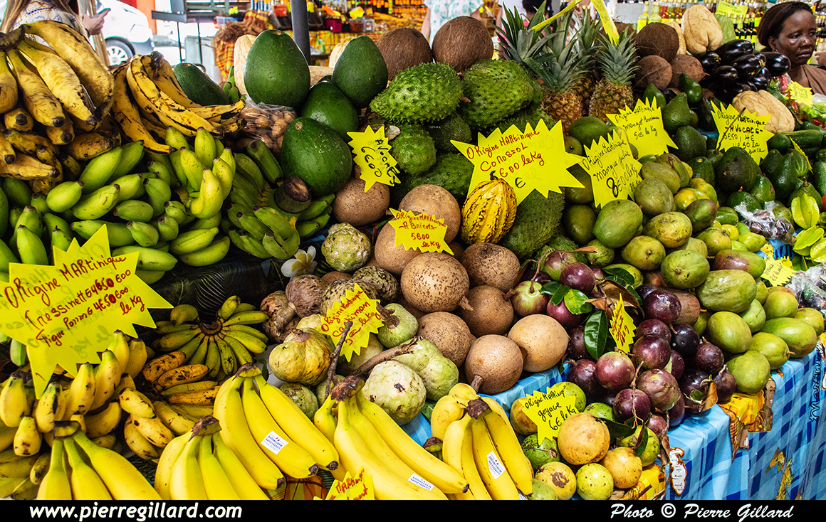 Puis nous remontons la rue Isambert jusqu’au Grand Marché couvert où c’est au tour de Louise de "prendre son pied". Nous déambulons parmi les différents étals dont la moitié propose des produits du terroir tandis que l’autre moitié est plus destinés aux souvenirs de la Martinique. Nous notons, particulièrement, le "Bwa Bandé" ! |