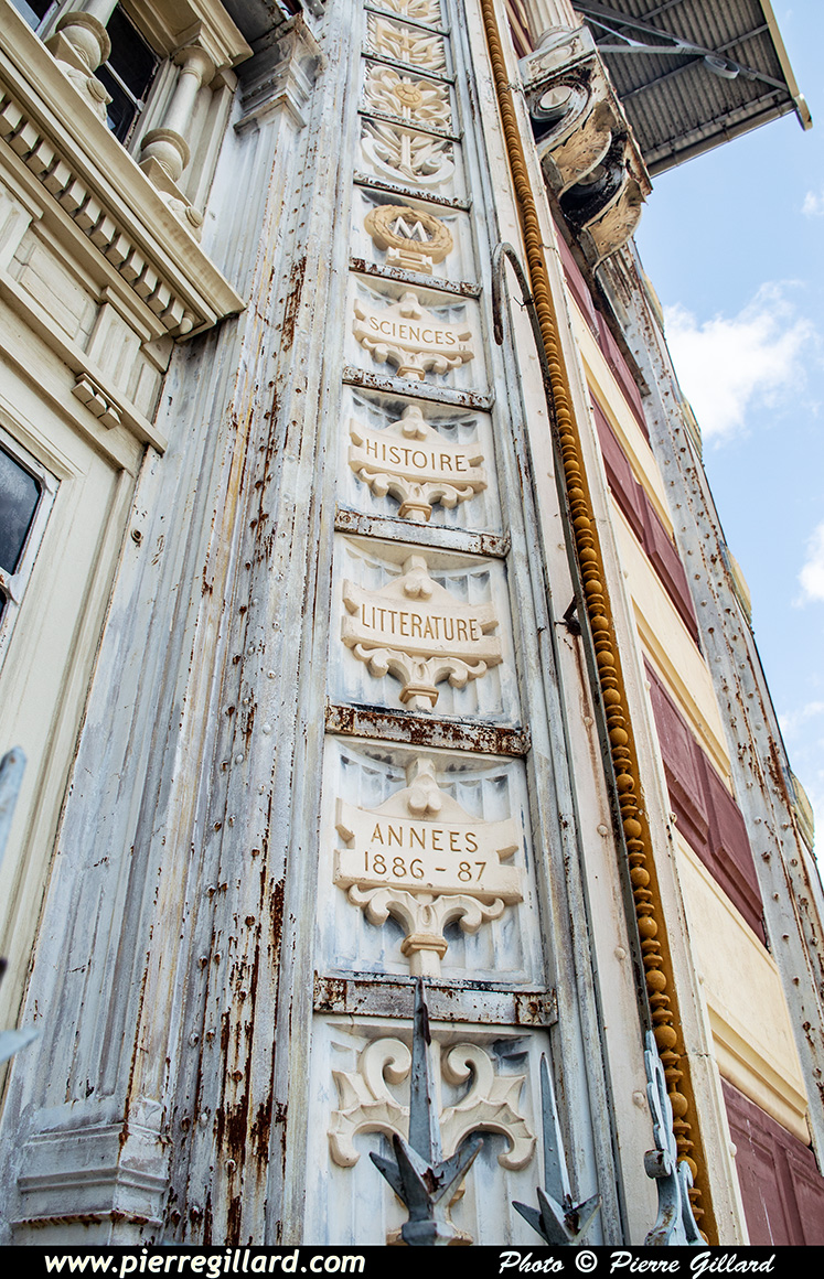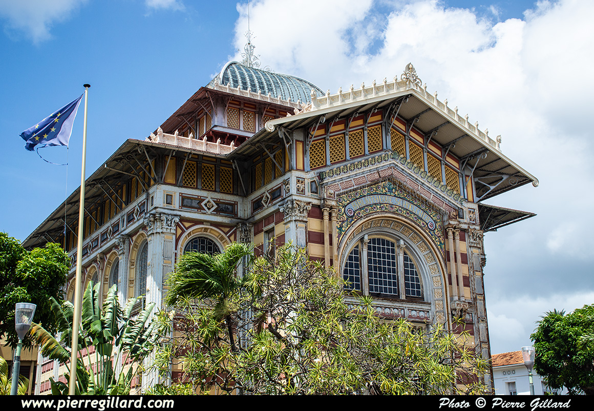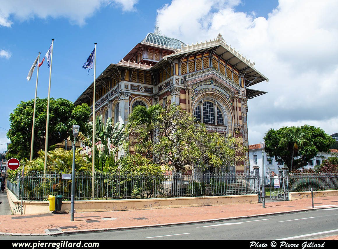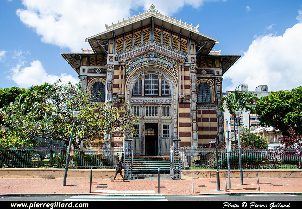 Un moment donné, les cloches se mettent à sonner alors que de nombreux fidèles commencent à affluer. Un office funéraire débute et c’est à ce moment que Louise et moi reprenons notre visite de la ville. Quelques photos de l’extérieur de cette cathédrale du XIXe siècle sont prises, puis nous rejoignons la rue de la Liberté que nous remontons jusqu’à la Bibliothèque Schœlcher qui date elle aussi du XIXe siècle. |