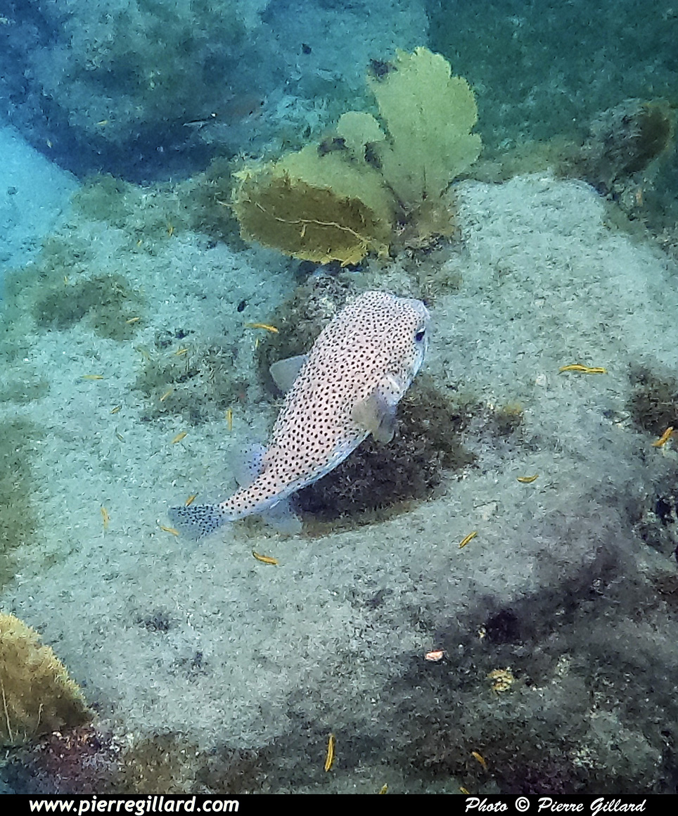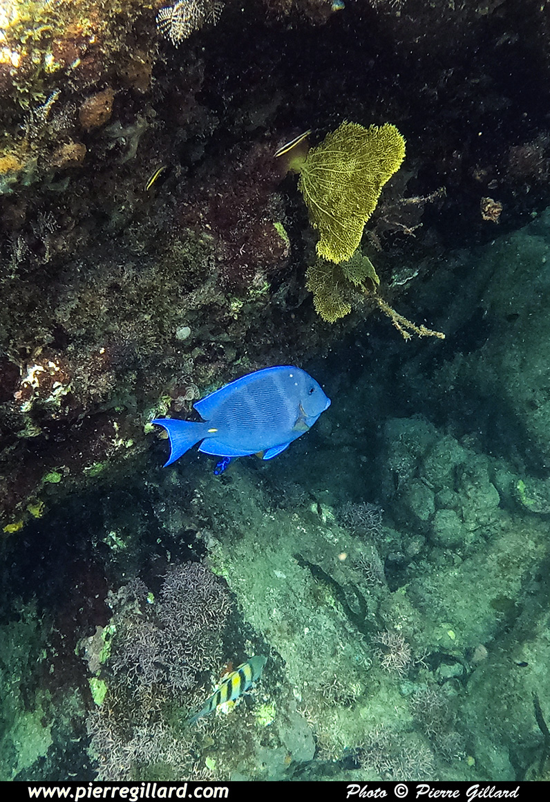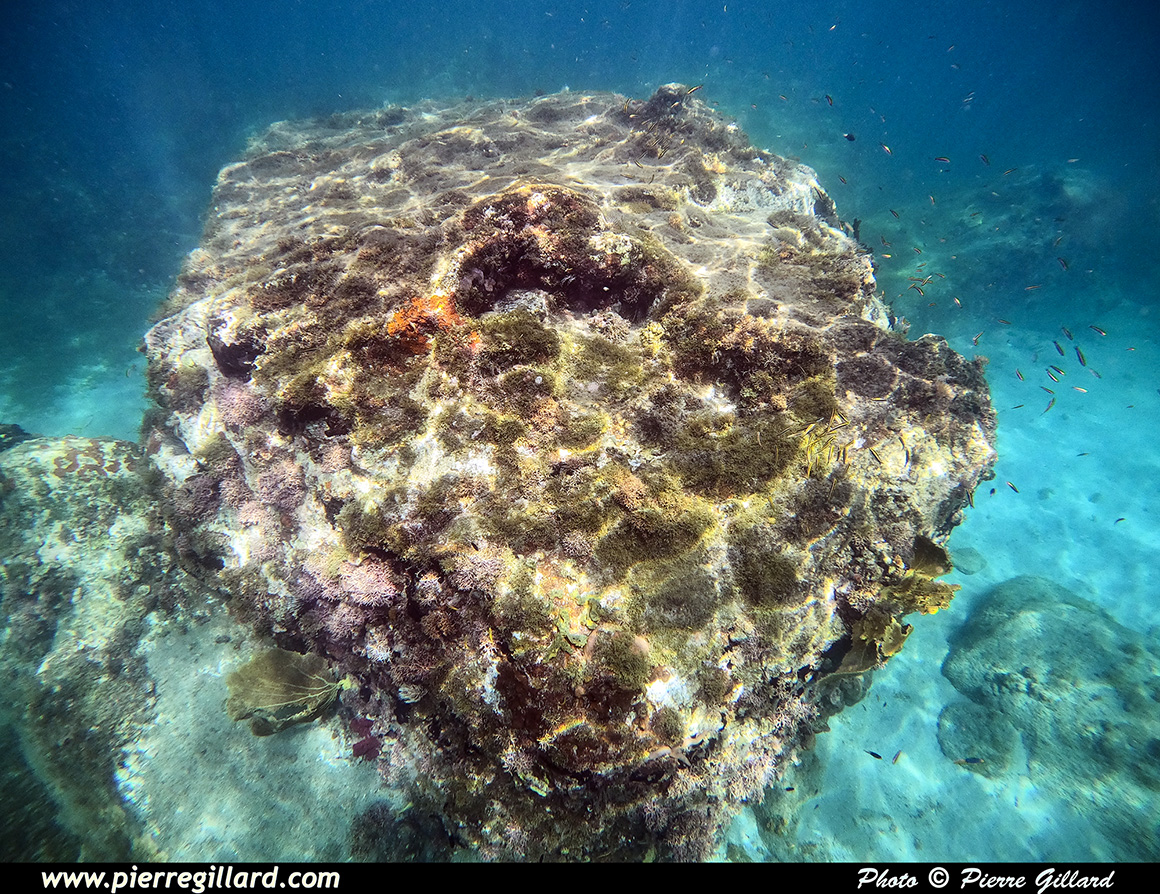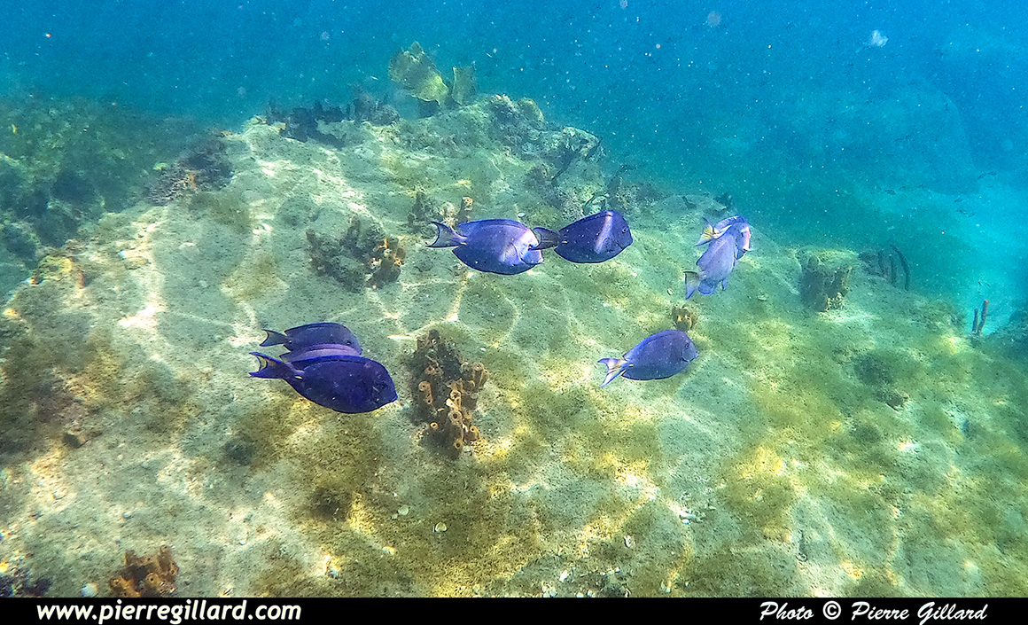 En effet, même si le site est moins attirant que les massifs coralliens que j’ai eu l’occasion de voir à Haïti ou à Roatán au Honduras, la variété de poissons est néanmoins très intéressante. Et ces derniers, étant probablement habitués à la chose, n’ont vraiment pas peur de la présence humaine. En effet, par moments, je suis littéralement entouré de poissons multicolores. Il y en a même de minuscules que l’on peut uniquement apercevoir que lorsqu’il y a un reflet du soleil ! J’ai donc beaucoup de plaisir à "survoler" les petits massifs rocailleux autour desquels tournent la multitude des poissons. Parfois, j’effectue un "canard" afin de me rapprocher du fond situé à quatre ou cinq mètres, mais sans lest, on remonte très vite. |