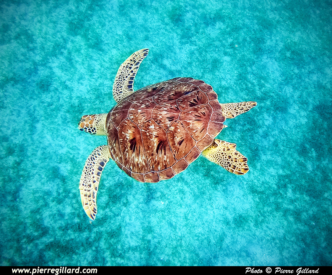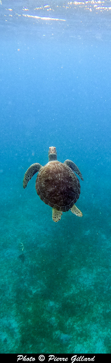 C’est ainsi que, nullement impressionnée par ma présence, elle remonte tout juste à côté de moi et, surtout, de ma GoPro ! Quel moment extraordinaire … Celui-ci restera désormais gravé éternellement dans ma mémoire. Étant maintenant devenue "ma tortue" puisque je suis le seul à la suivre, je continue à nager au-dessus d’elle. Elle remontra encore deux autres fois pour mon plus grand bonheur. |